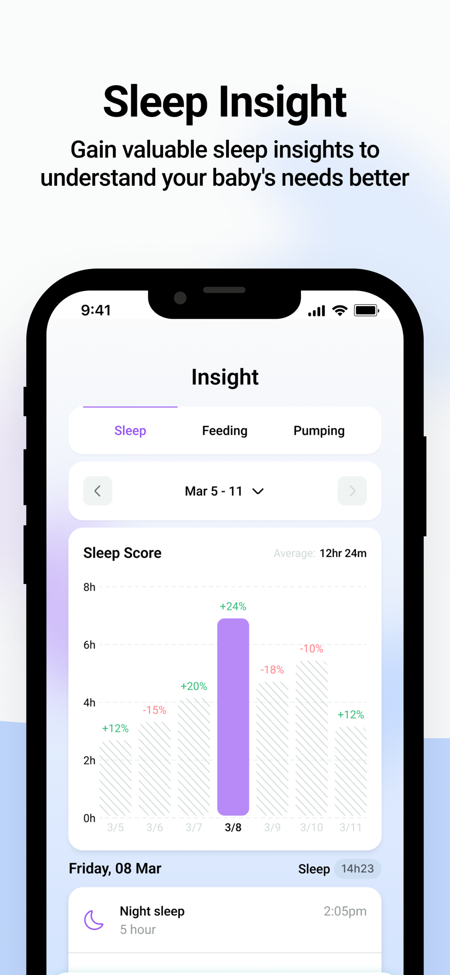 (1) Sleep Tracking and Analysis: Record detailed sleep duration, wake time, nap time, and nighttime sleep with just a few taps. Besides that, we analyze sleep data and provide intuitive charts.
