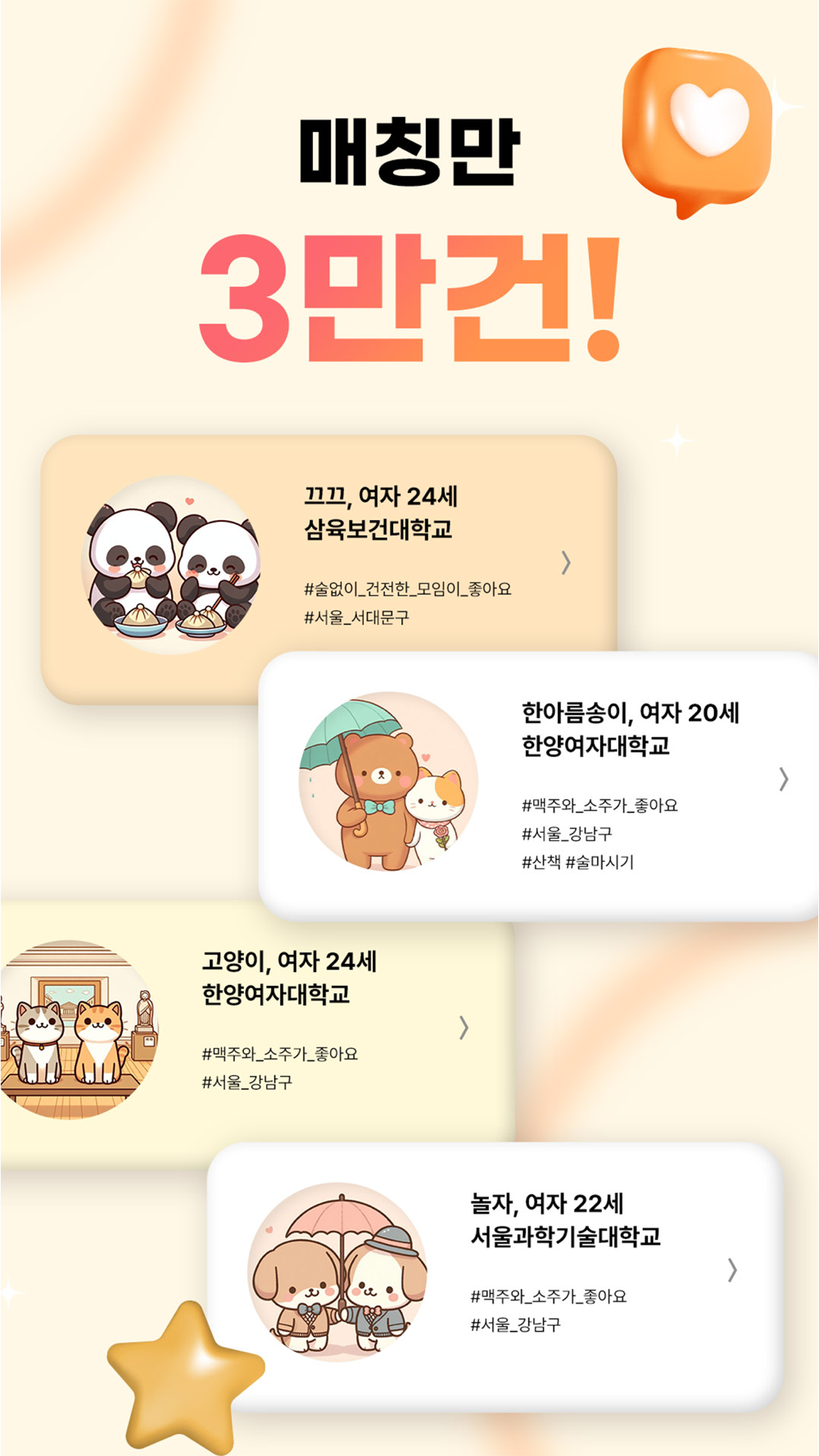 사진 없이 나를 표현하는 캐릭터로 매칭이 진행되기 때문에 안전하게 매칭 가능!