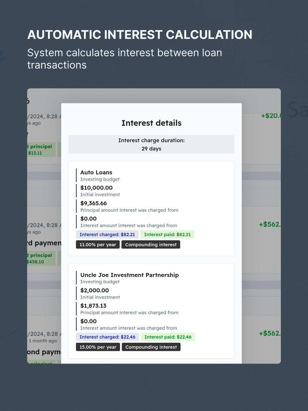 Maintain an organized record of all loans. Easily enter, edit, and monitor repayments, fees, refunds, and loan forgiveness, keeping an accessible record for every loan transaction. Add manual interest or fees to any loan as needed.