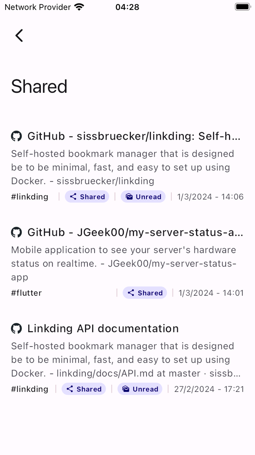 Linkdy is a client for Linkding, a bookmark manager. Linkding is a self-hosted service that allows you to store links as bookmarks on your own home server. Linkdy allows you to access that bookmarks from the ease of your mobile phone, presenting it on a beautiful and functional interface.