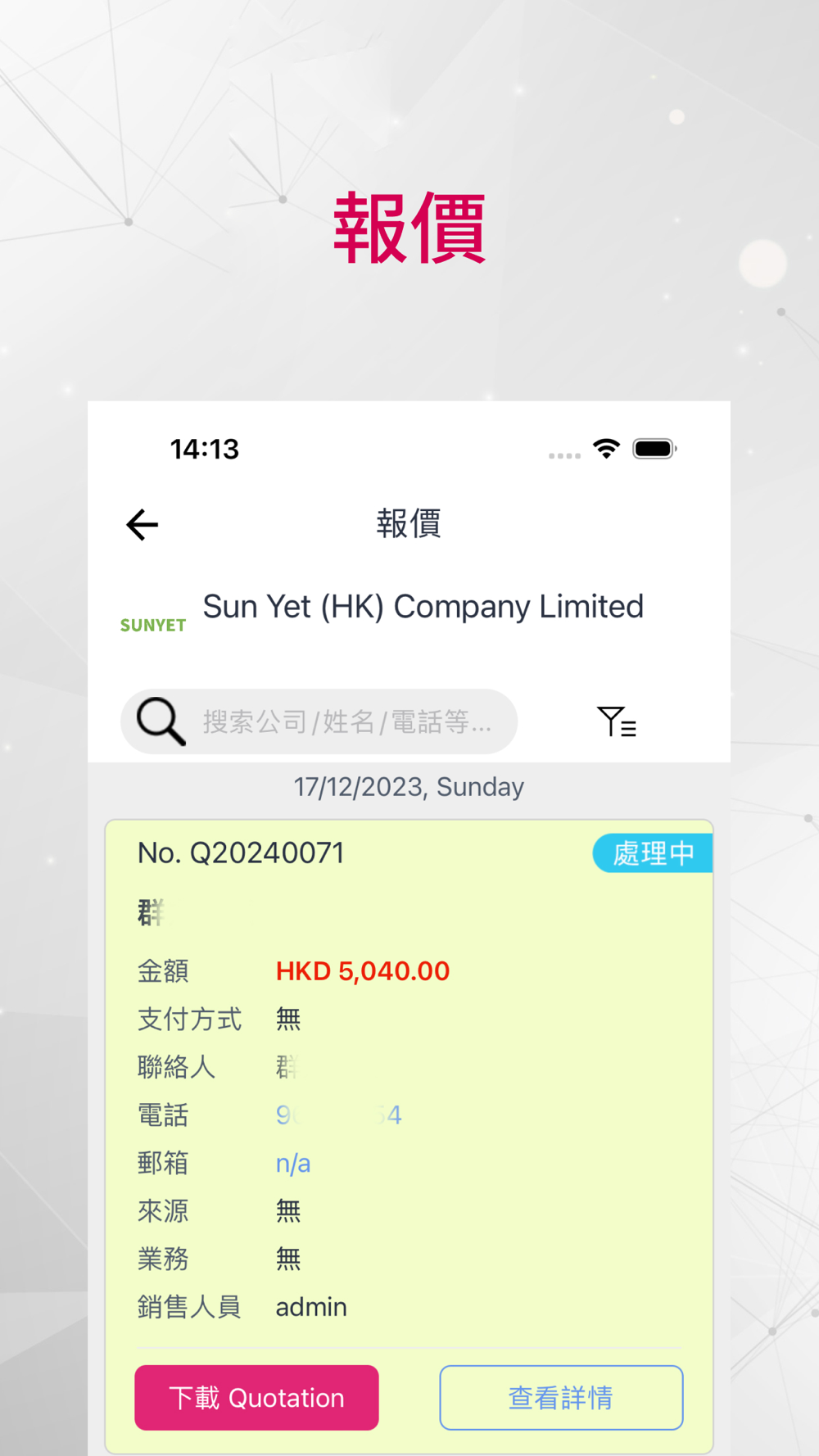 此Apps便於銷售對接生意,含有生意分析統計,可以便捷查看公司生意數目,並可用於管理客戶,管理報價和管理發票等等