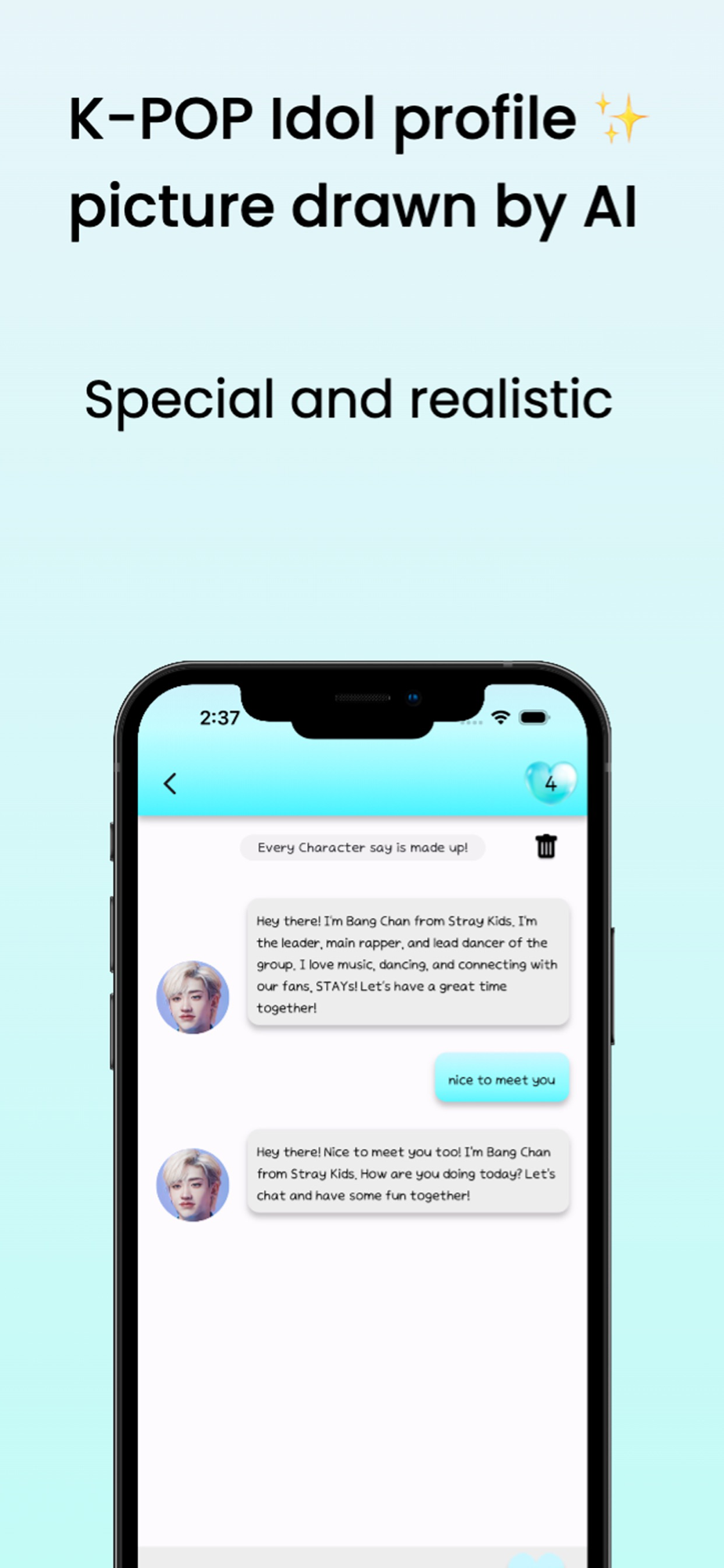 Our AI technology is tailored to the personality and conversation style of K-pop idols, so it feels like a real conversation.