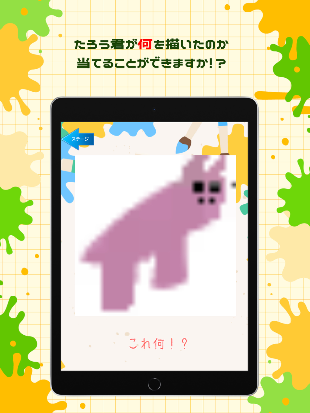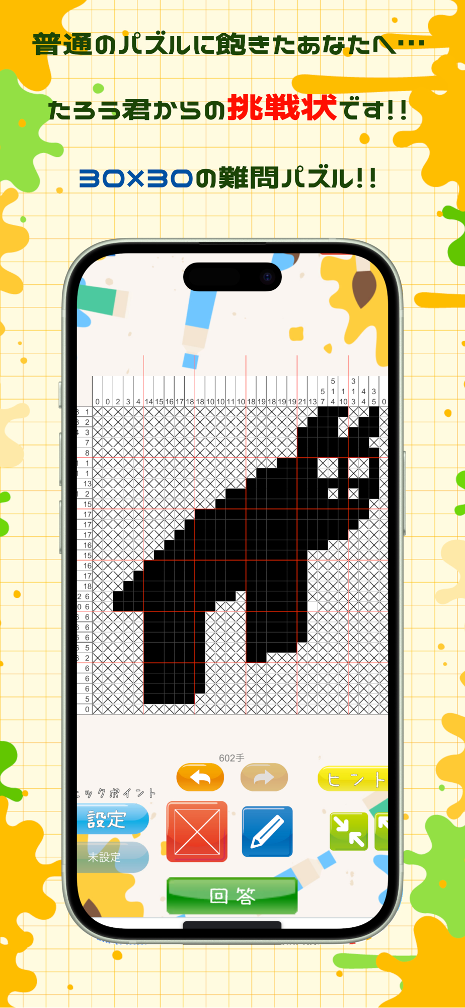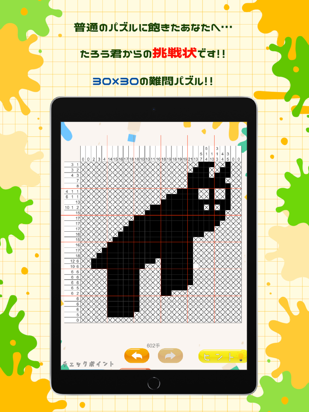 このアプリは、たろう君が描いた絵をほぼそのまま問題として出題する難易度高めのお絵描きロジックです。