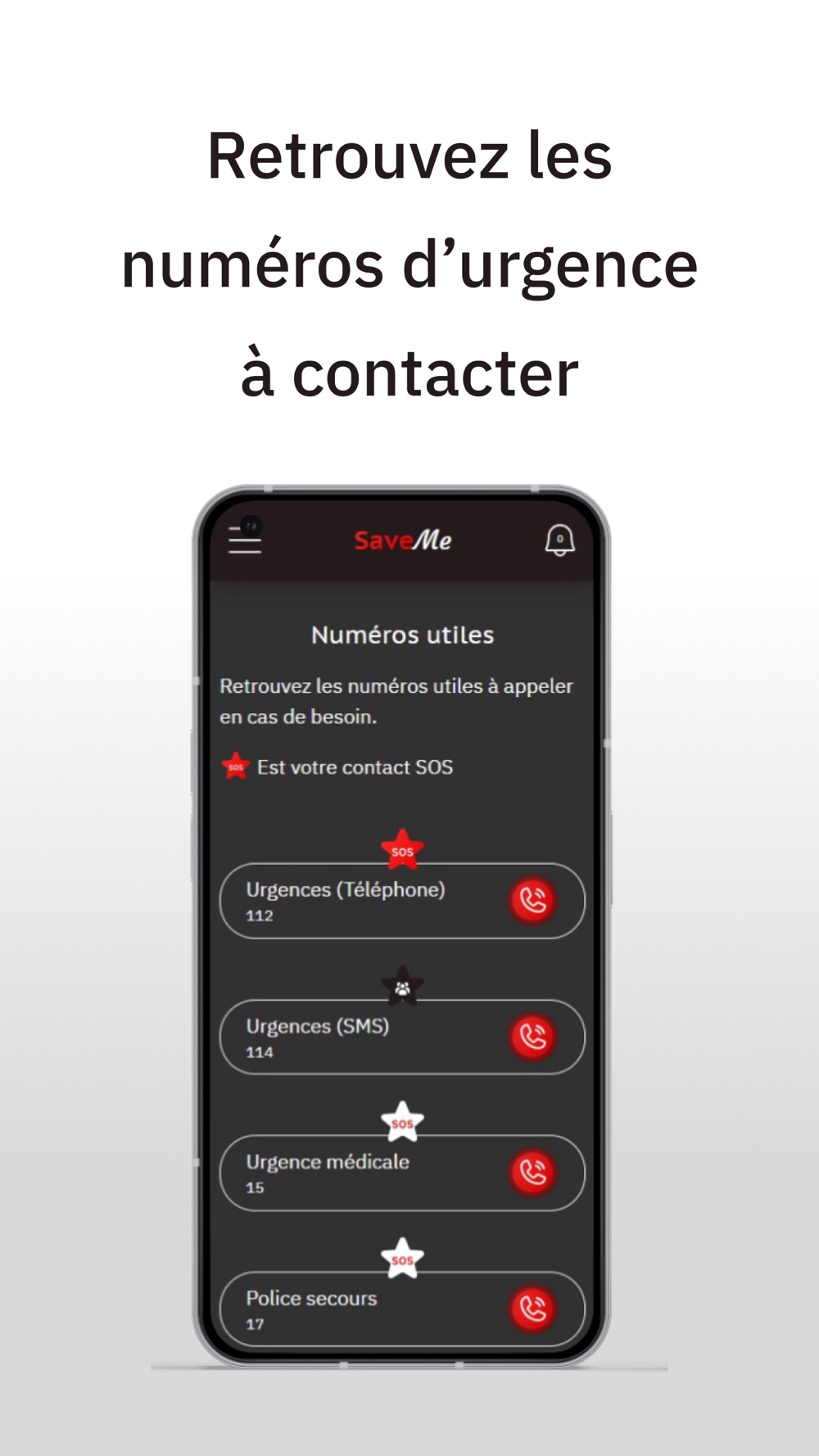 Sur Save Me, vous pouvez également retrouver tous les numéros utiles en cas de problème, comme les médecins ou les pharmacies de garde, le numéro d’aide pour femmes victimes de violence, enfance maltraitée ou encore harcèlement scolaire. Tous les numéros nécessaires pour vous venir en aide sont à portée de main.