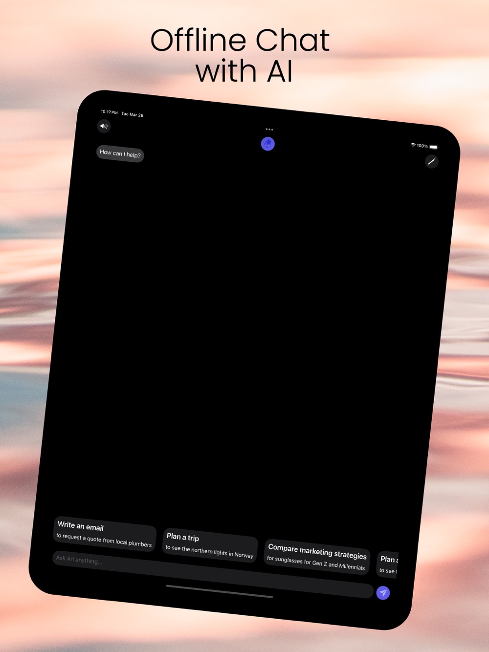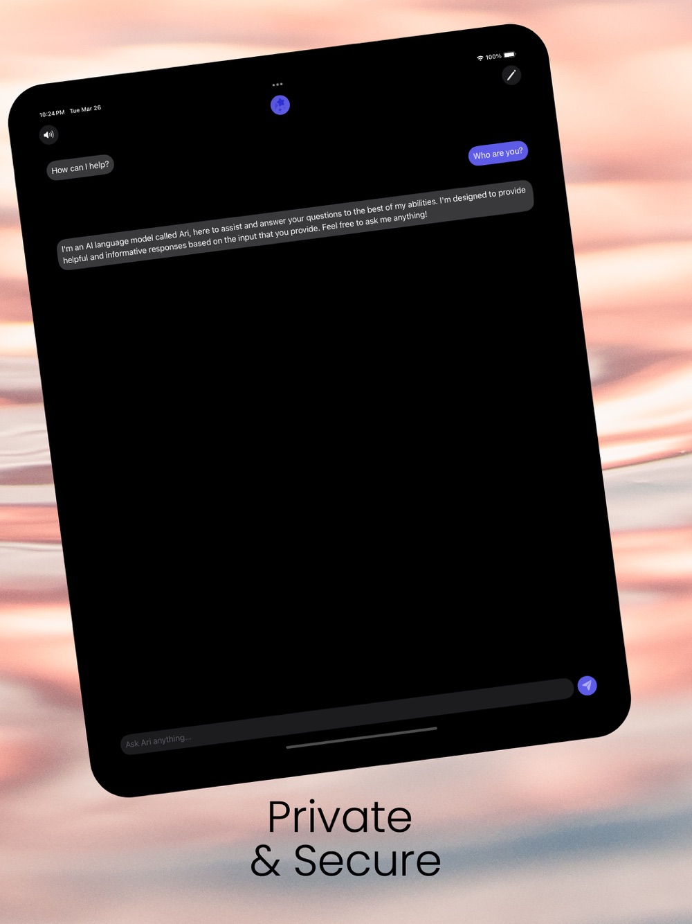 Meet Ari, your personal AI assistant, right on your device! Similar to ChatGPT-4 and other popular AI assistants, Ari operates entirely offline, meaning no need for an internet connection.