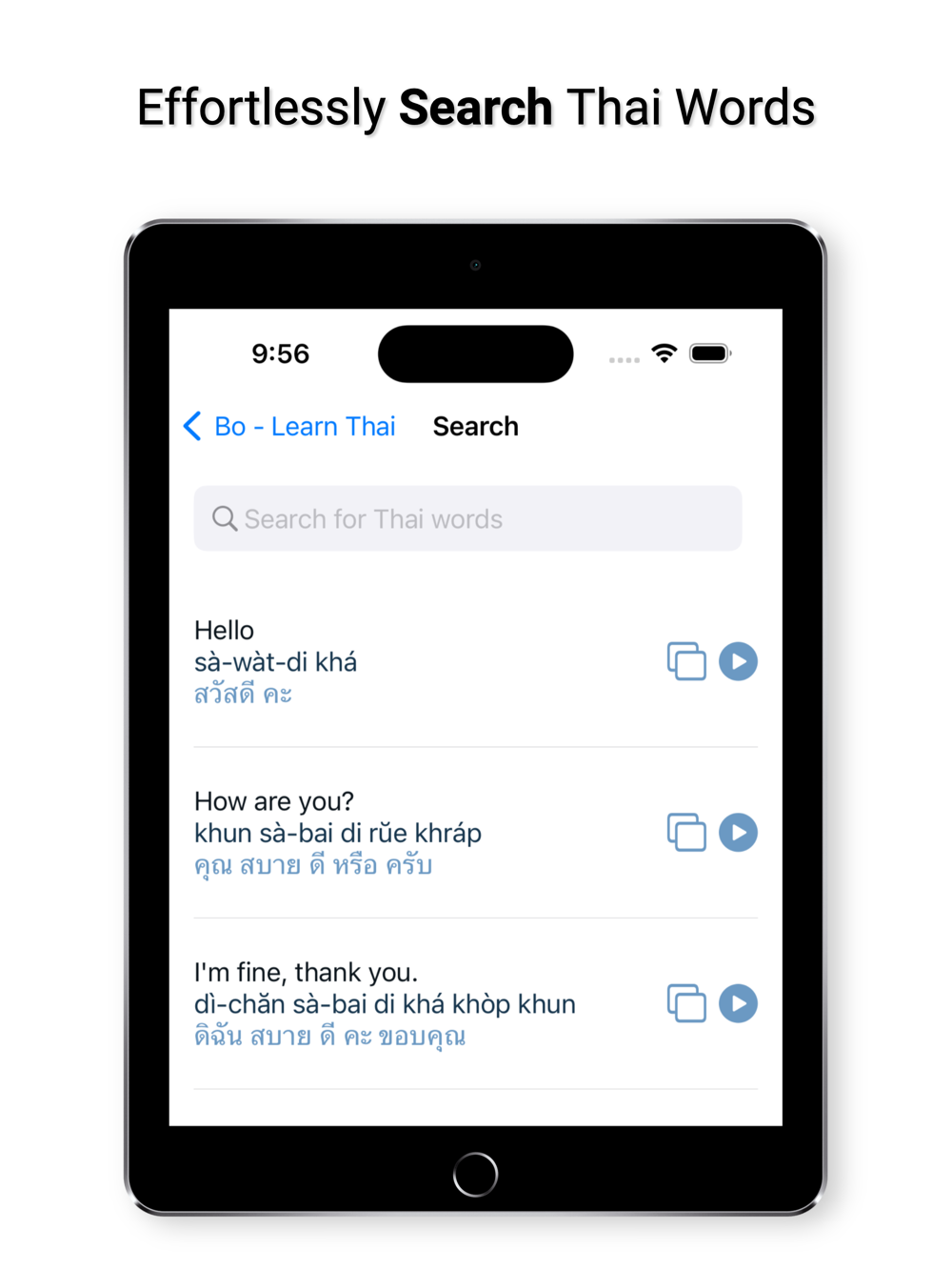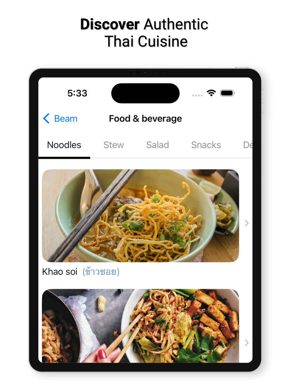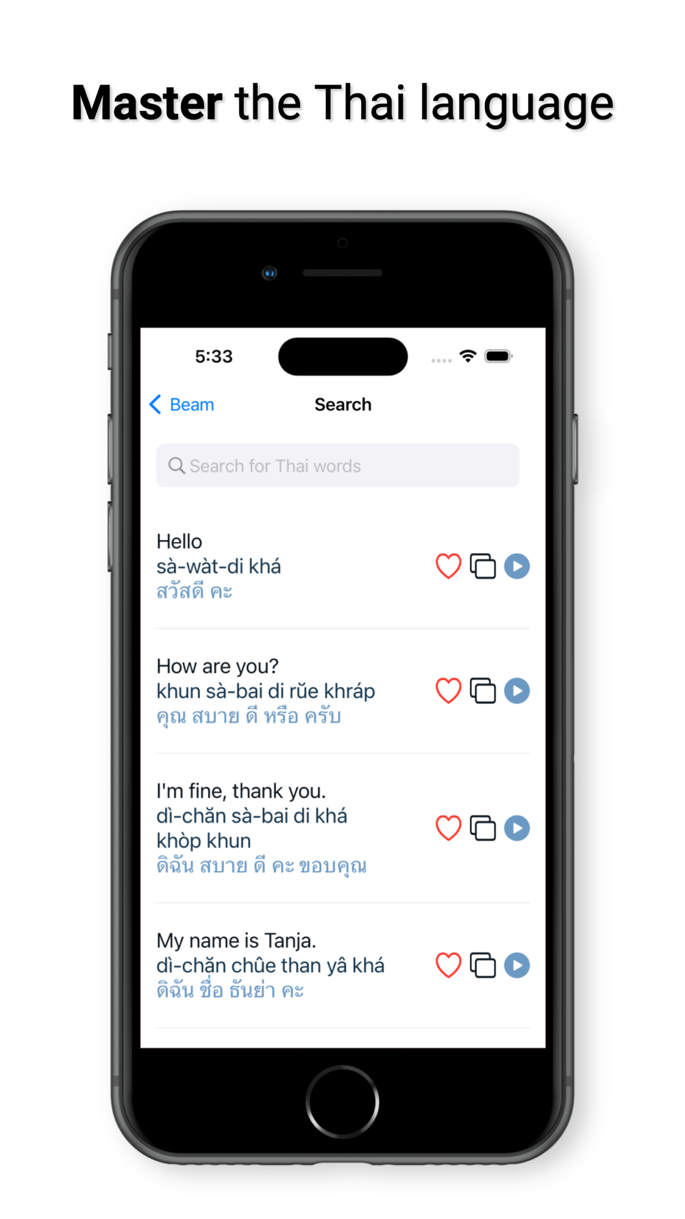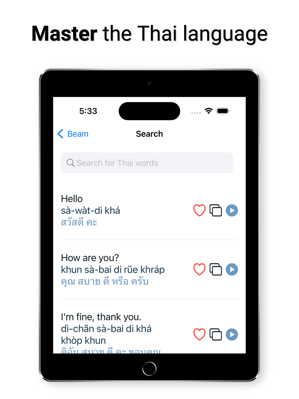 Embark on an exciting journey to master the beautiful Thai language with Beam - Learn and Speak Thai. Whether you’re a beginner or looking to enhance your skills, our app offers an immersive experience that makes learning Thai fun, easy, and effective. Dive into Thai culture, especially its rich culinary heritage, as you explore and search for Thai words. With dark mode support, your learning experience is comfortable and eye-friendly, day or night. Unlock the secrets of Thai pronunciation by listening to authentic Thai voices, and practice speaking by repeating after native speakers to perfect your accent. With an extensive collection of vocabulary and phrases, categorized for easy navigation, you’ll build a solid foundation in the Thai language and culture. From everyday greetings to essential travel phrases and beyond, Beam has you covered.
