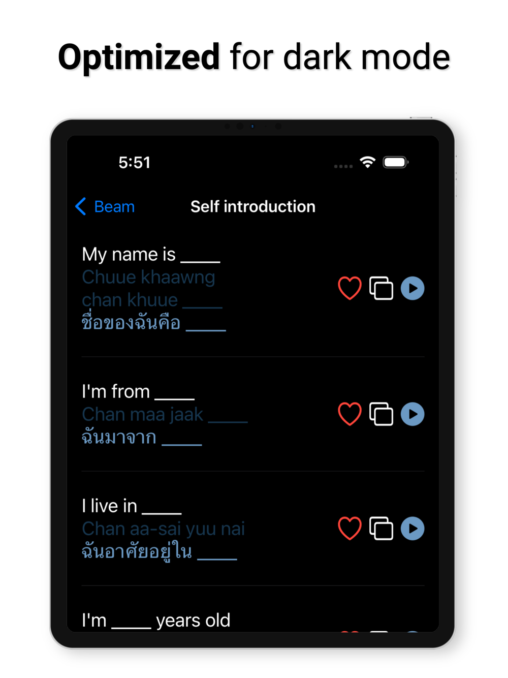 Our app features authentic Thai voices for accurate pronunciation, an extensive vocabulary and phrases for practical use, offline access for learning anytime, anywhere, and a user-friendly interface for seamless navigation, all supported by dark mode for comfortable learning. Start your Thai language journey today with Beam - Learn and Speak Thai. Let’s embark on this exciting adventure together!