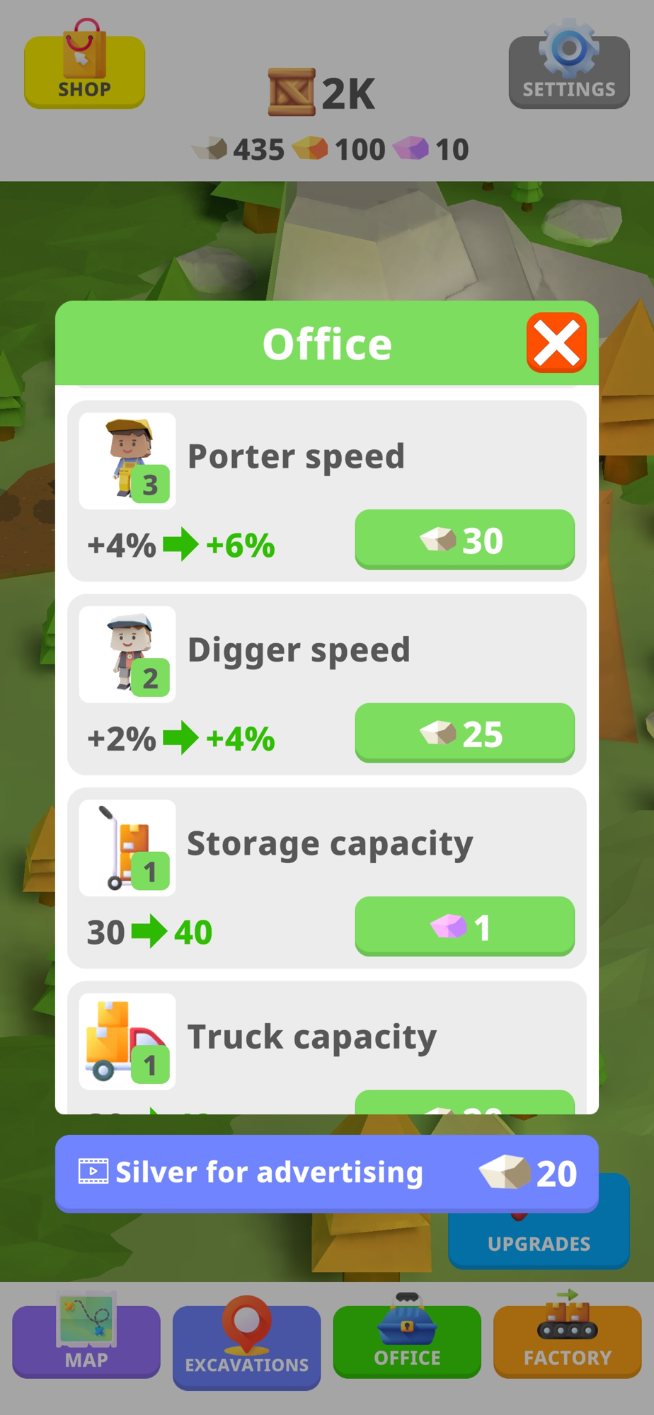 Factory and office facilities. Manage your office for higher productivity – diggers and porters, storage and truck capacity, etc. Extract gold and silver at your factory. And become the wealthiest idle mining tycoon!