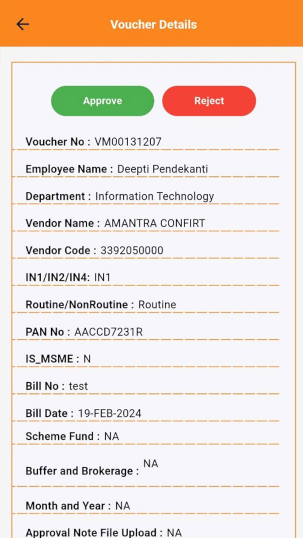 An expense management system for a mobile app provides users with a comprehensive solution to approve or reject the voucher directly from their smartphones or tablets. This mobile app extends the functionality of traditional expense management systems to offer users the flexibility and convenience of managing their expenses on the go. Furthermore, the app often integrates with the organization's expense management system or accounting software, ensuring seamless synchronization of expense data between the mobile app and the central system. This integration enables finance teams to access and review expense data in real-time, streamlining the approval and reimbursement process.