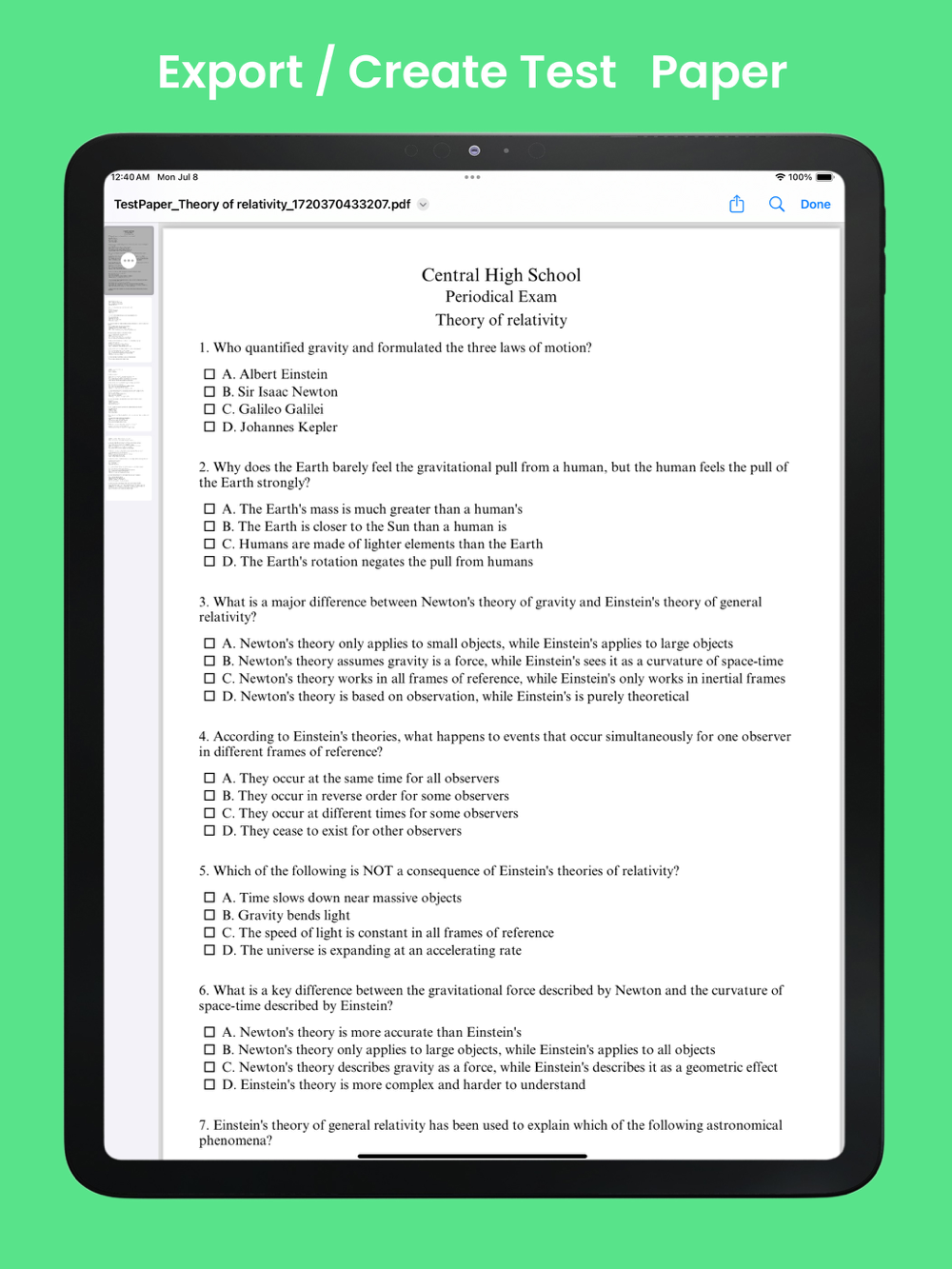 Welcome to Test Maker AI Questions Generator, the perfect tool for students and teachers looking to create quizzes and test papers effortlessly. With cutting-edge AI at its core, our app takes the hassle out of quiz creation, generating high-quality questions on any topic you can imagine.