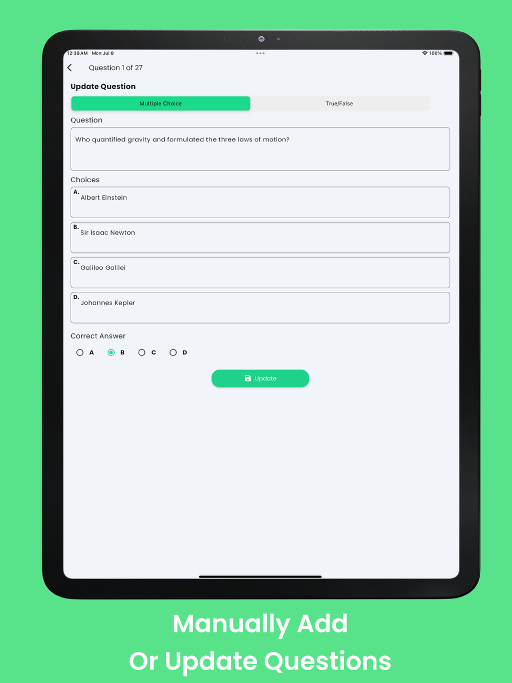 Effortless Quiz Creation: No more time-consuming writing! Our AI analyzes your chosen topic (history, science, literature, languages – anything!) and instantly generates multiple choice and true/false questions.