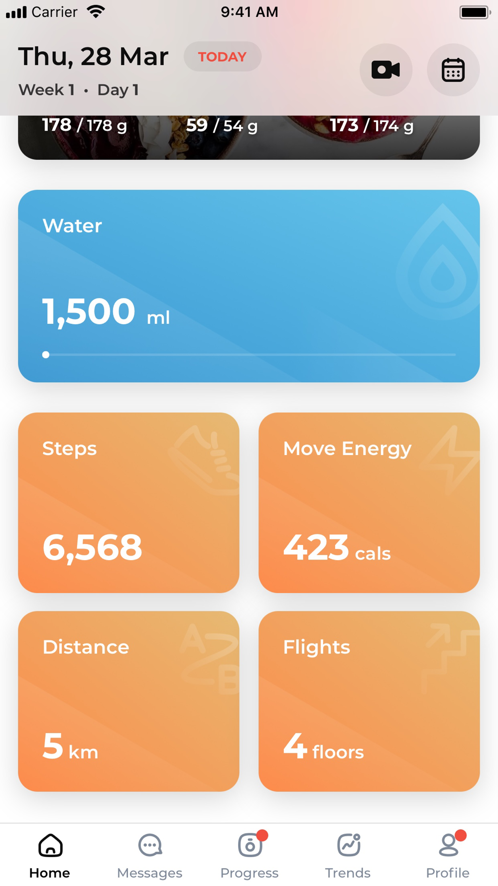 The app integrates with Apple Health to show your daily activity - distance, steps, active energy, and flights to help you better achieve your goals.