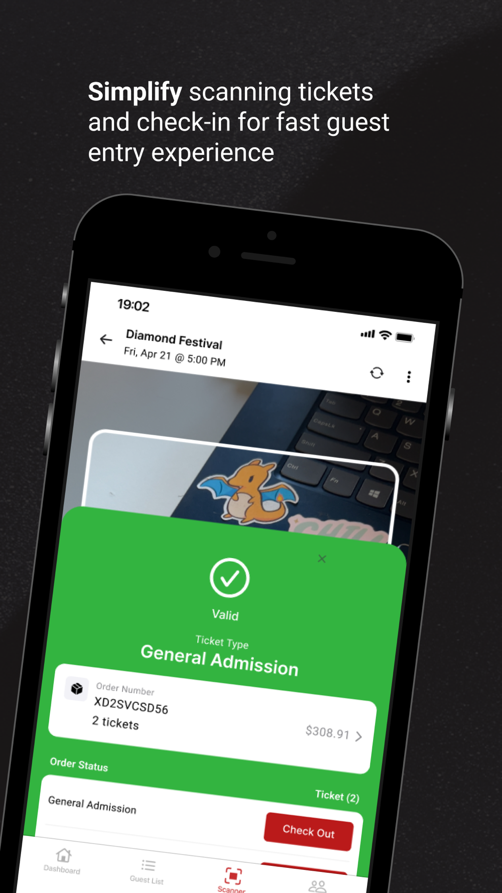 Efficient Check-In: Scan tickets with your mobile device's camera or search for guests by name for quick entry.