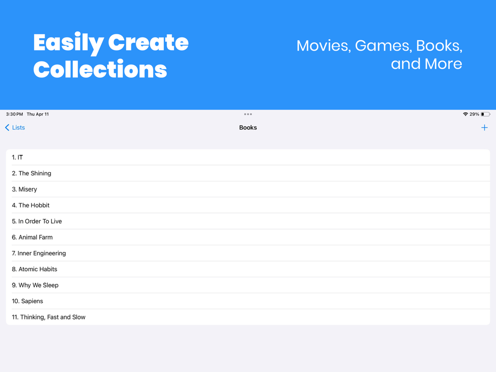 Discover, Organize, Rank – With Rankify, take control of your collections and lists like never before. From movies to games, tasks to goals, organize your passions and curate them to perfection. All securely managed offline with seamless iCloud syncing across your devices.