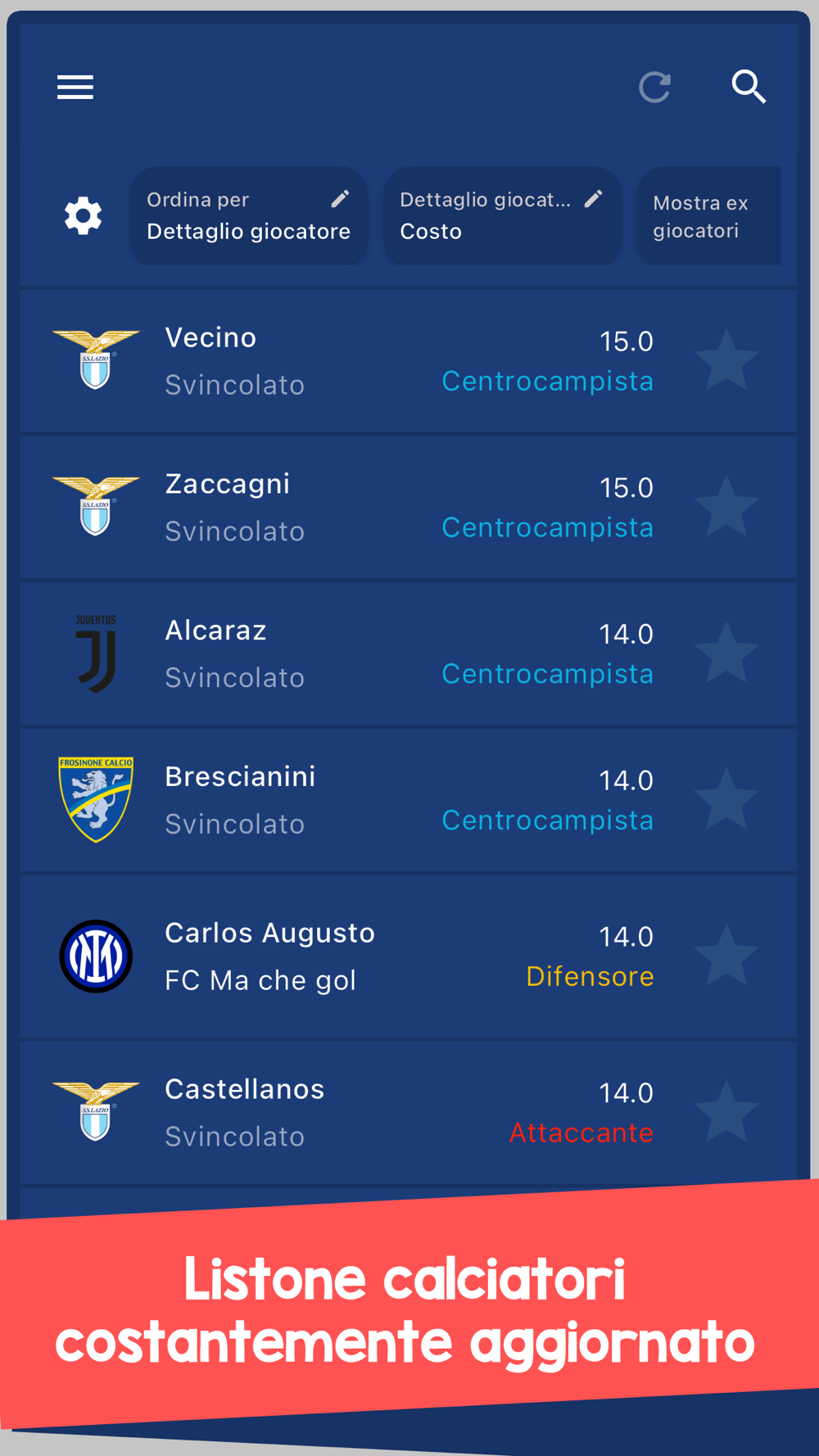 Grazie al listone dei calciatori sempre aggiornato, potrai pianificare in anticipo la tua strategia: assegna da 1 a 5 stelle ai calciatori su cui punterai e non lasciarteli scappare quando verranno banditi durante l'asta! E se qualcuno proverà a spiare la tua strategia, nascondi i valori dei preferiti con un semplice tasto.
