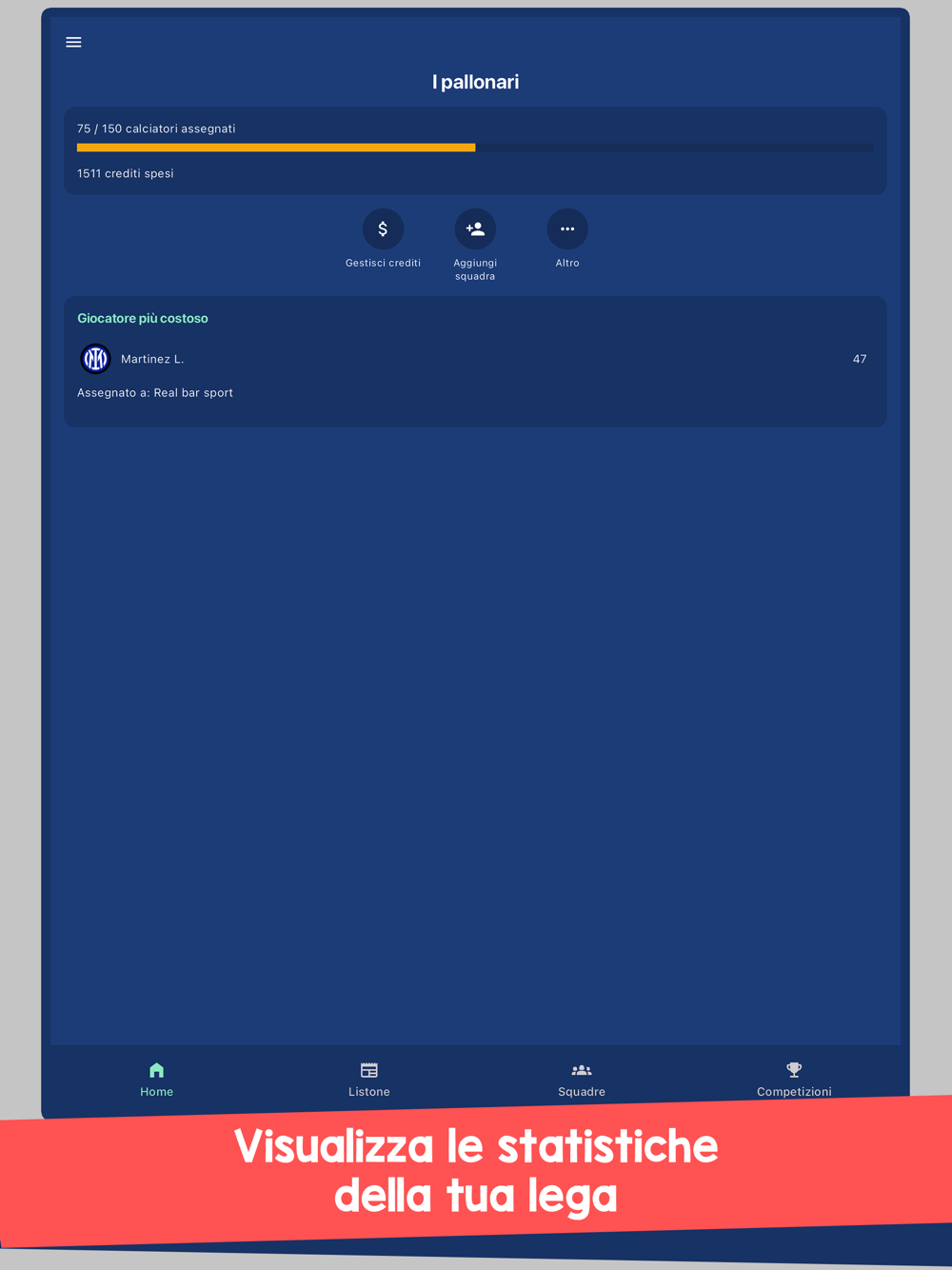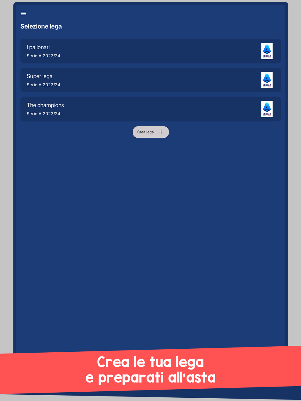 - Crea la tua lega settando fantasquadre, crediti iniziali, regole per l'asta e per il calcolo dei voti settimanali.