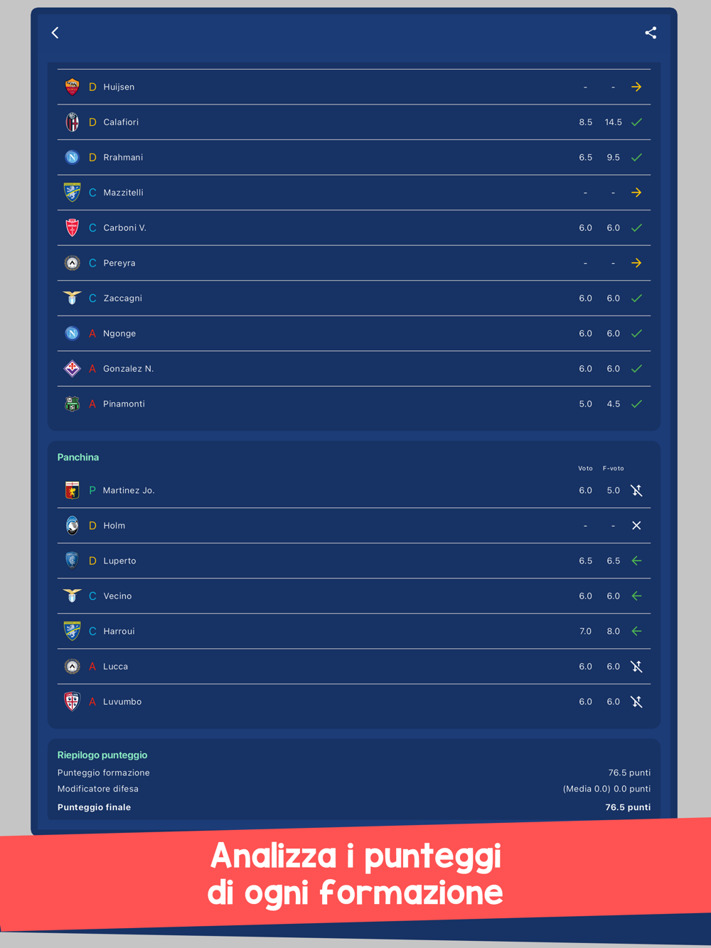 - Condividi formazioni, punteggi di giornata e classifica tramite WhatsApp, Facebook, Gmail e tutti i tuoi social preferiti.