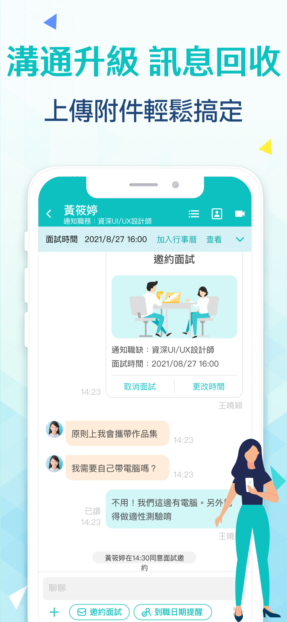 完整記錄與求職者聯絡過程,查找方便,還可清楚分類求職者意願,讓您透過訊息管理有效掌握聯絡狀況。可以透過邀約功能發送面試事件卡片,即時掌握求職者訊息回饋;可與求職者進行即時溝通,上傳附件,圖片輕鬆搞定