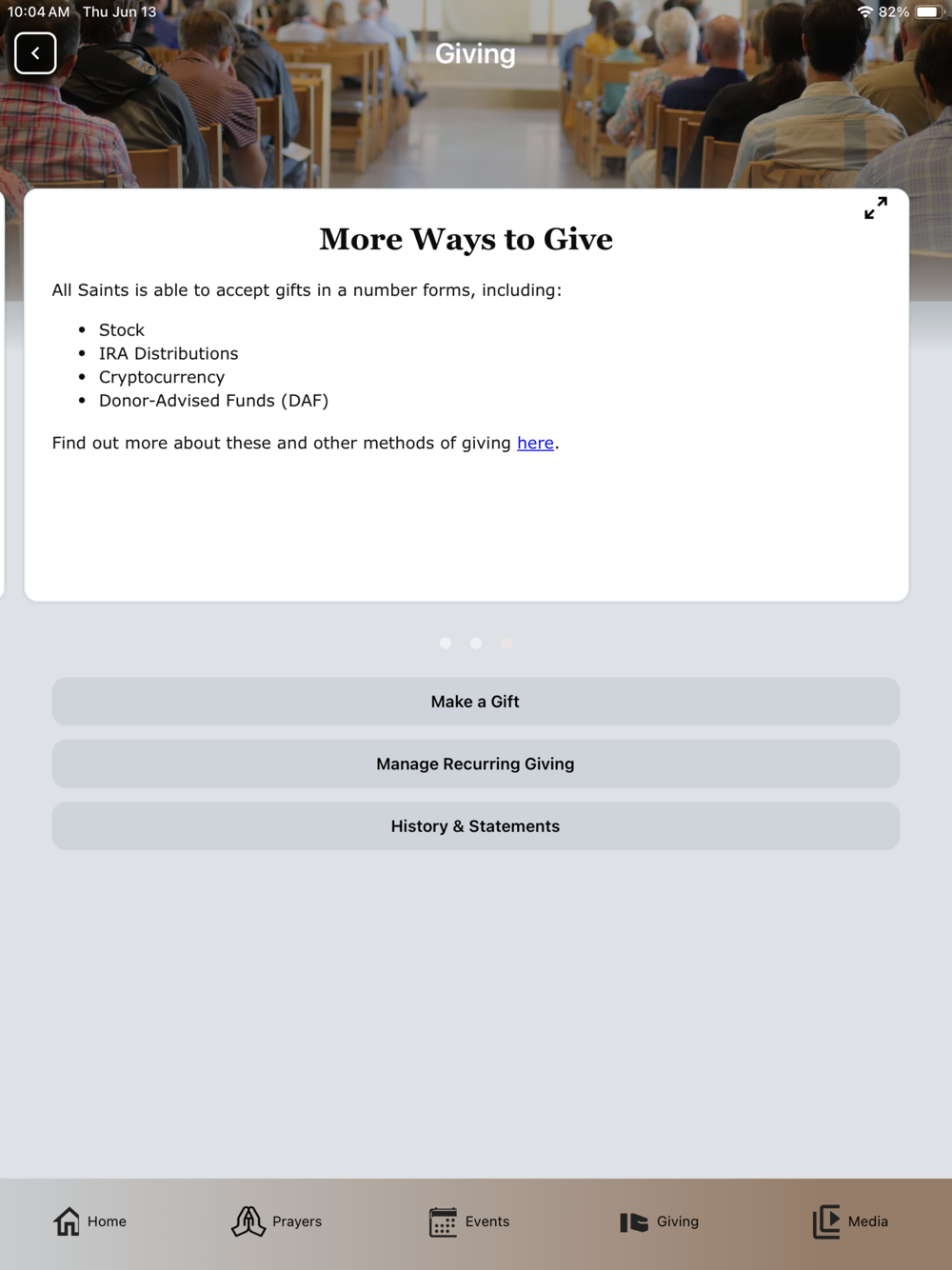 Welcome to our mobile app where you can connect with your fellow church goers, easily sign up for events, view your giving history, make a gift, watch previous sermons, submit prayer requests, plus much more...