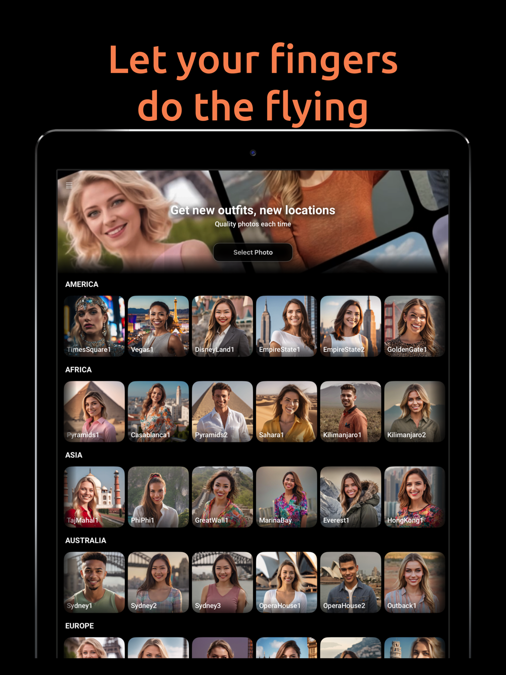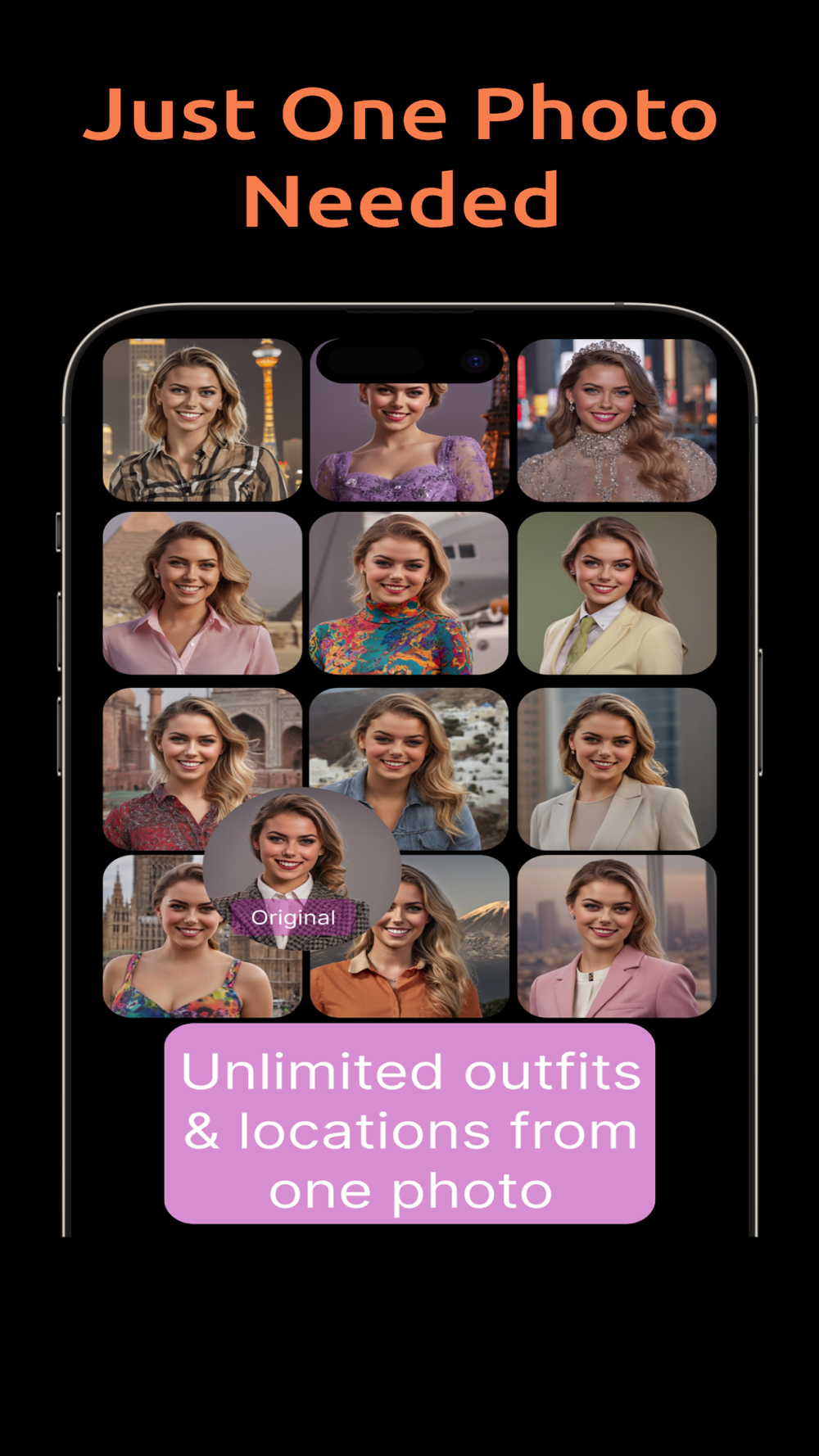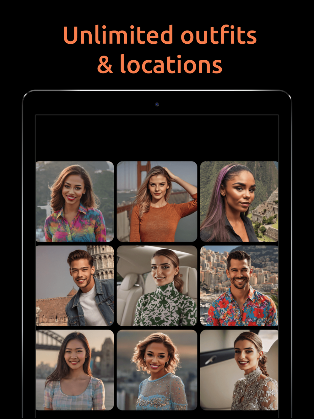 Travel the world without leaving home! Use just one photo to create unlimited photos of yourself in exclusive locations around the world, and wearing the most beautiful outfits. Works perfectly for all genders and skin tones. New Outfits, New Locations added often. Get hi-resolution professional quality photos in seconds.