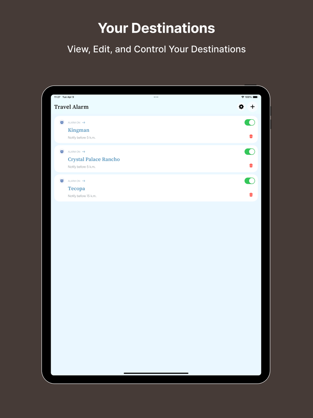 But that's not all. With Travel Alarm, the possibilities are endless. Set alarms for multiple destinations without limitations. Customize alarm sounds to suit your preferences and enable or disable alarms for individual destinations with ease. And when your journey is complete, effortlessly delete all destinations in one fell swoop.