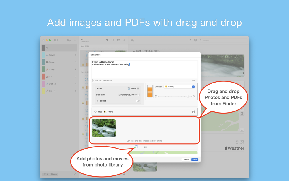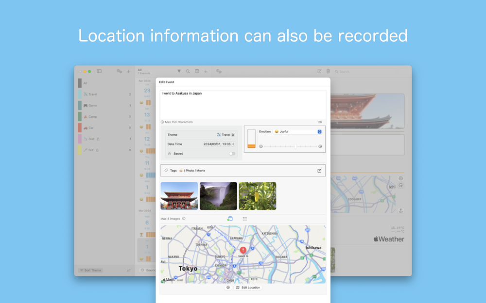 In addition to images, videos, and location information, you can also record your emotions at the time.