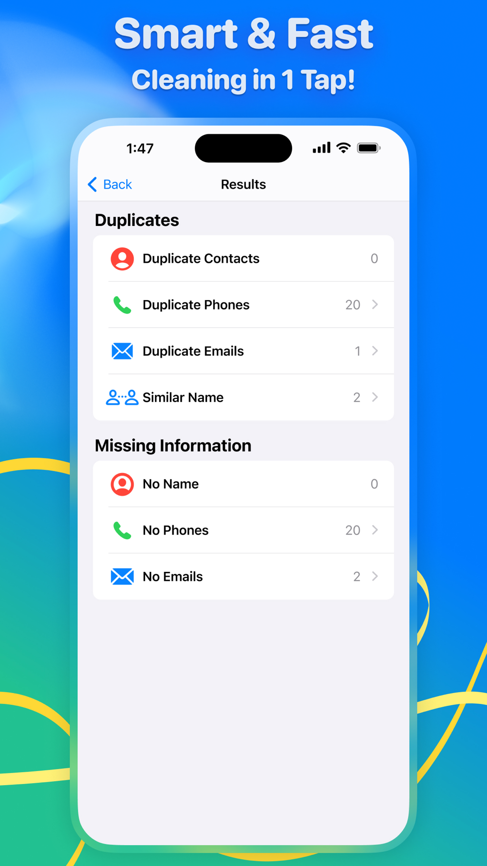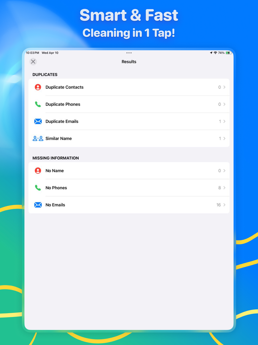 • Simple merging of duplicate contacts, including Duplicate Phones, Duplicate Emails, and Similar Names