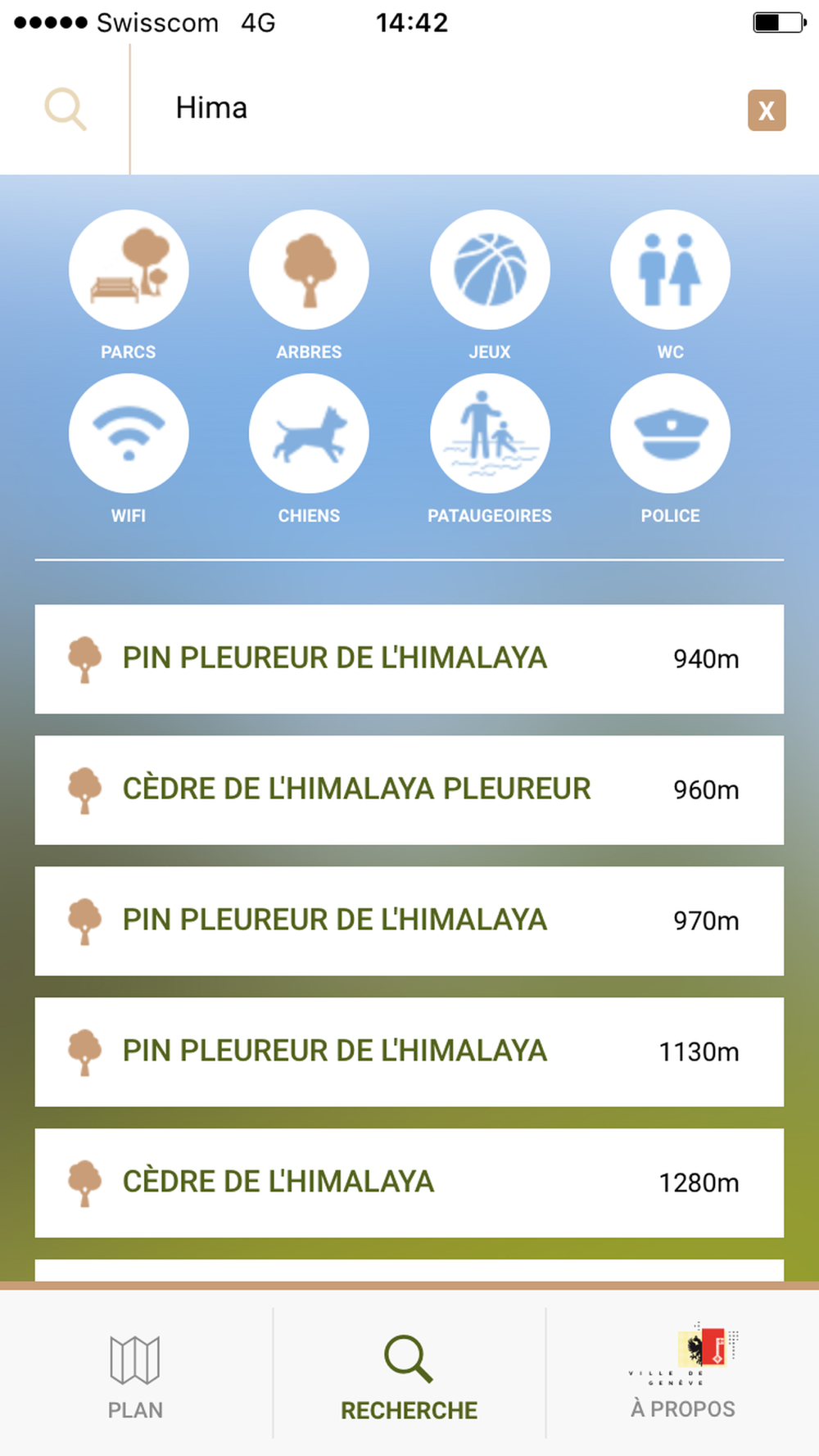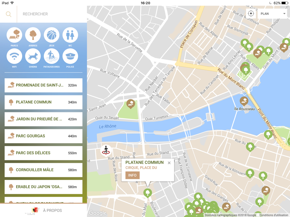 L’application Parcs Genève vous présente une sélection de plus de 250 arbres emblématiques ainsi que tous les parcs de la Ville de Genève et leurs principaux équipements: places de jeux, WC publics, zones wifi, espaces de liberté et itinéraires de promenade pour les chiens, pataugeoires et postes de police.