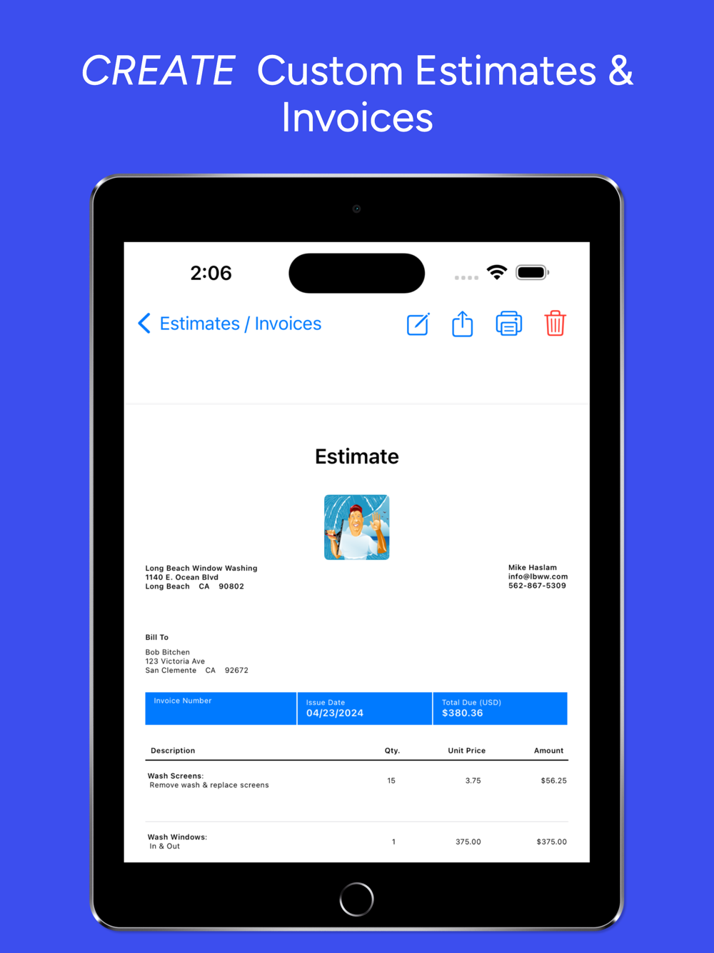 • Instant Estimates & Invoices: Generate accurate estimates, detailed invoices, and receipts on-the-go.