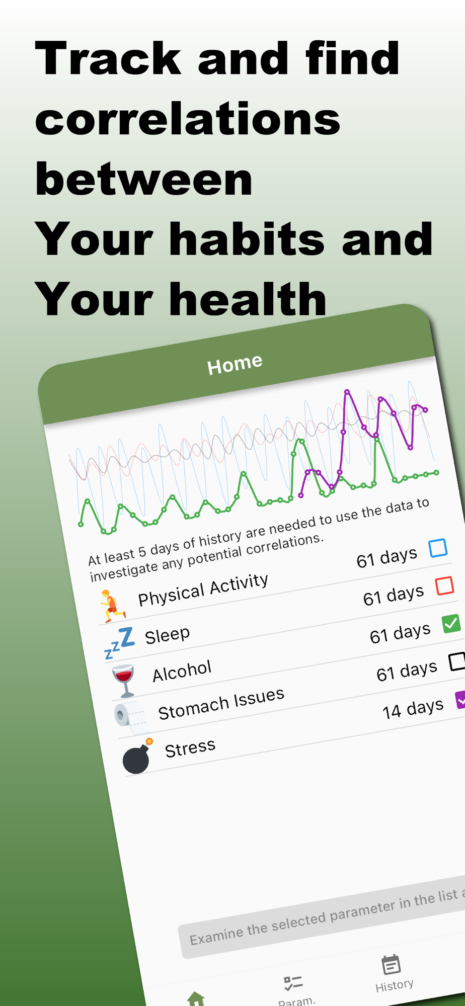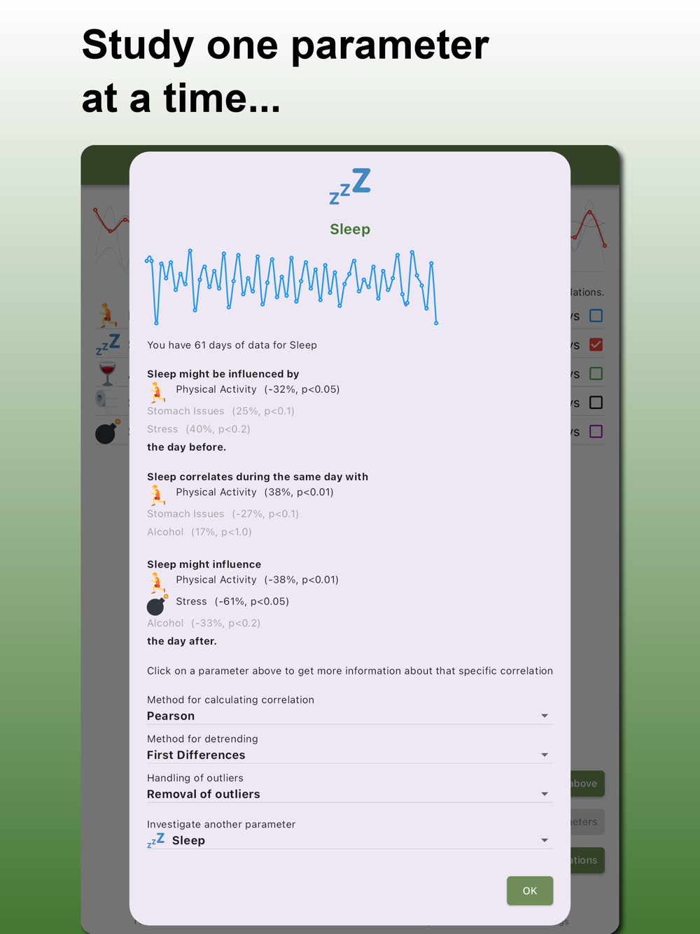 Correlation Finder offers a variety of predefined parameters that you can track daily, including sleep quality, exercise, dietary habits, and much more. Additionally, you can create and define your own custom parameters to tailor the app to exactly what you're interested in.