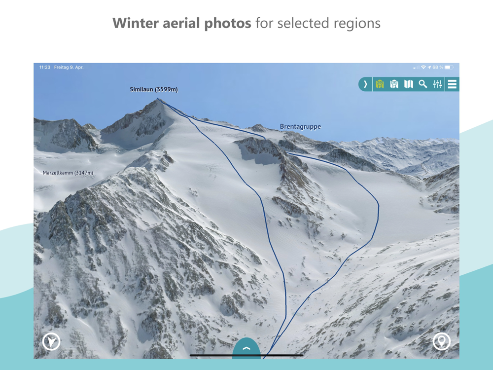 The app offers an unprecedented level of security. In the photo-realistic 3D map you can read the exposure and condition of the terrain and identify danger spots. In bad weather, in fog or at night, you can find your way around as the map depicts the real terrain. Another safety aspect: you can load the maps onto your smartphone for offline use.