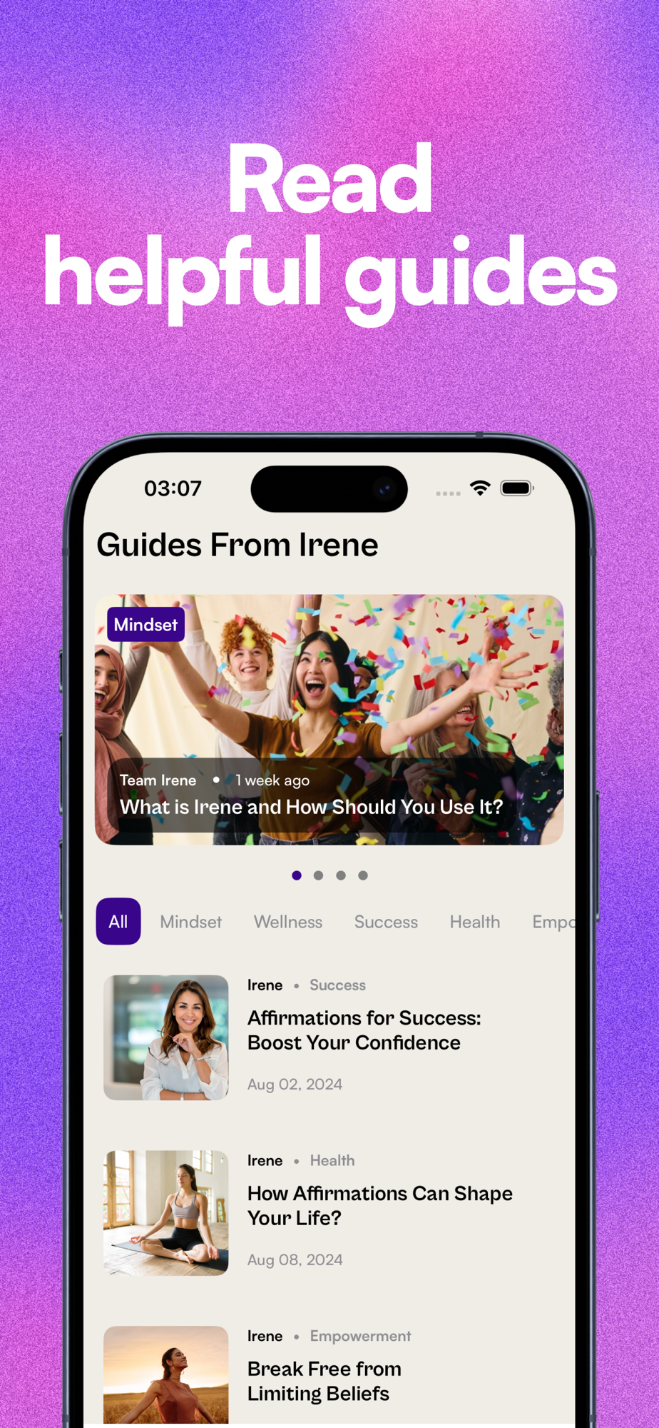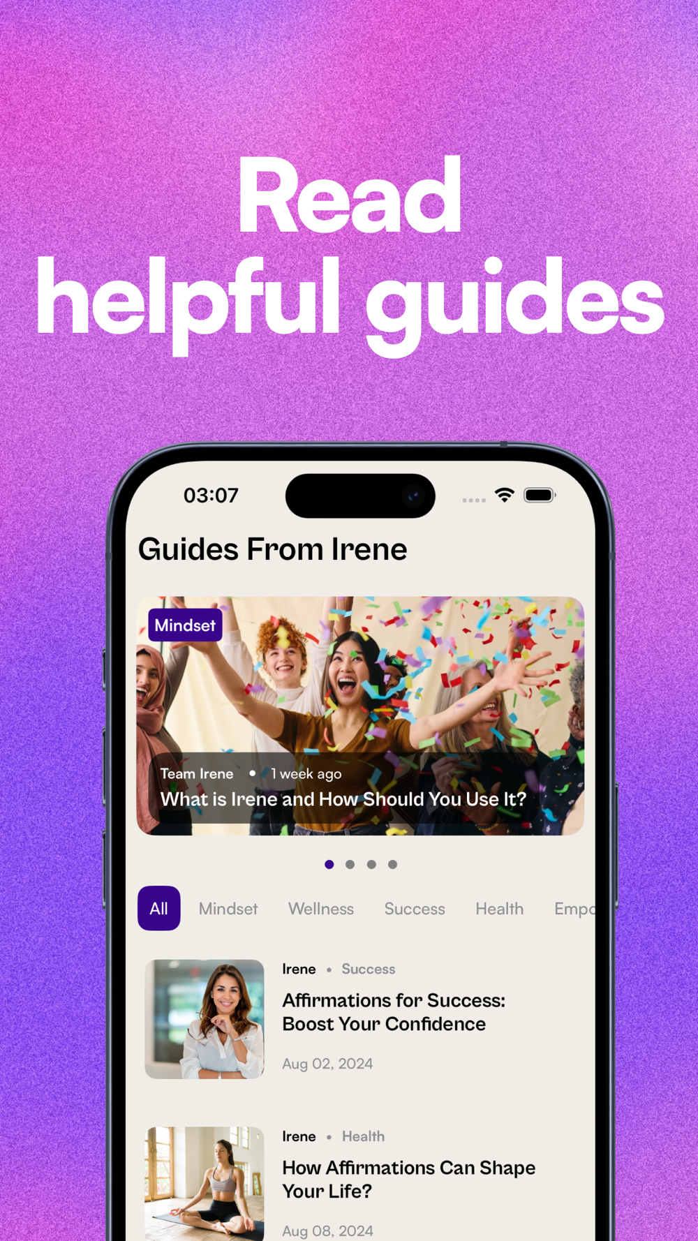 Whether you're looking to boost your confidence, reduce anxiety, improve relationships, or achieve your dreams, Irene is your daily companion for positive change. Start your journey to a more empowered, mindful you today!