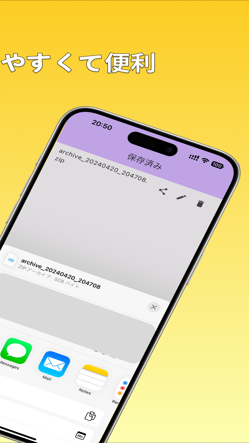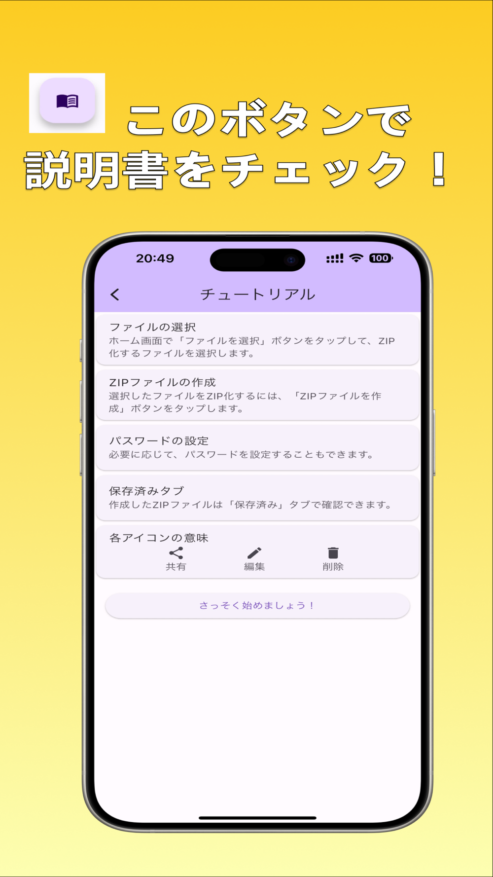 このアプリではパスワード付きZIPファイルを簡単に作成することができます。名前の変更や削除も簡単で、シンプリに管理可能です。