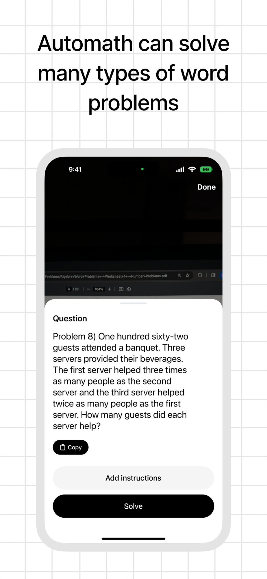 Take a photo of any math problem with the Automath app and get instant step-by-step solutions that show you how to get to the answer. Automath can solve billions of math problems, even complex word and geometry problems, whether it's in a textbook, on a screen, or handwritten.