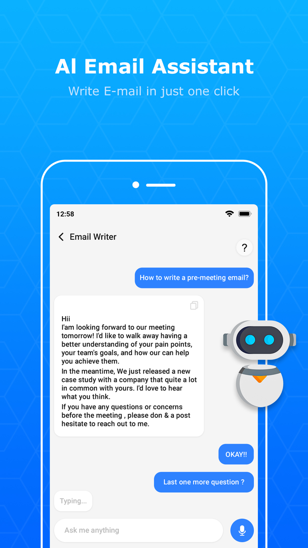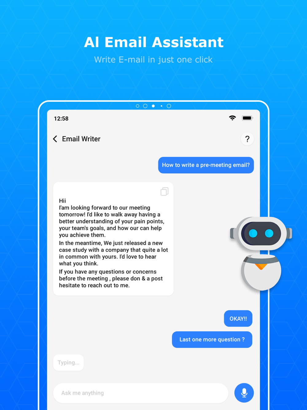 AI email assistants are tools that use artificial intelligence to help you manage your mails. Our AI tools are built to analyze and generate emails according to your instructions. The AI E-mail assistant provides personalized suggestions and story tellings to help you write better, faster, and more efficiently.