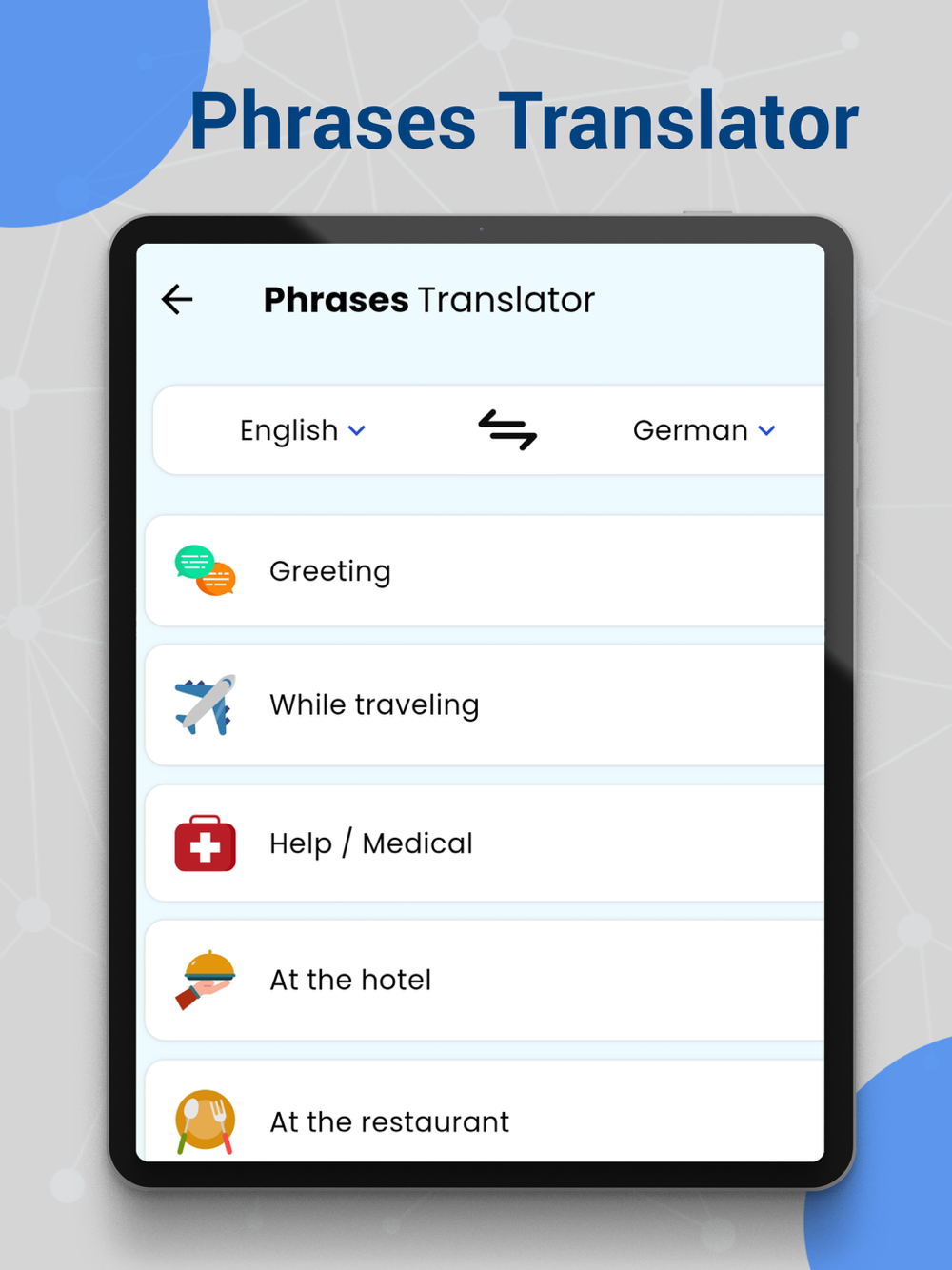 문구: 문구 기능은 인사말, 여행, 레스토랑 등 주제별로 분류된 유용한 문구 및 표현 모음을 제공합니다. 사용자는 여행 중이거나 다른 언어로 의사소통하는 동안 다양한 상황을 탐색하기 위해 바로 사용할 수 있는 문구를 탐색하여 대화를 더욱 매력적이고 의미 있게 만들 수 있습니다.