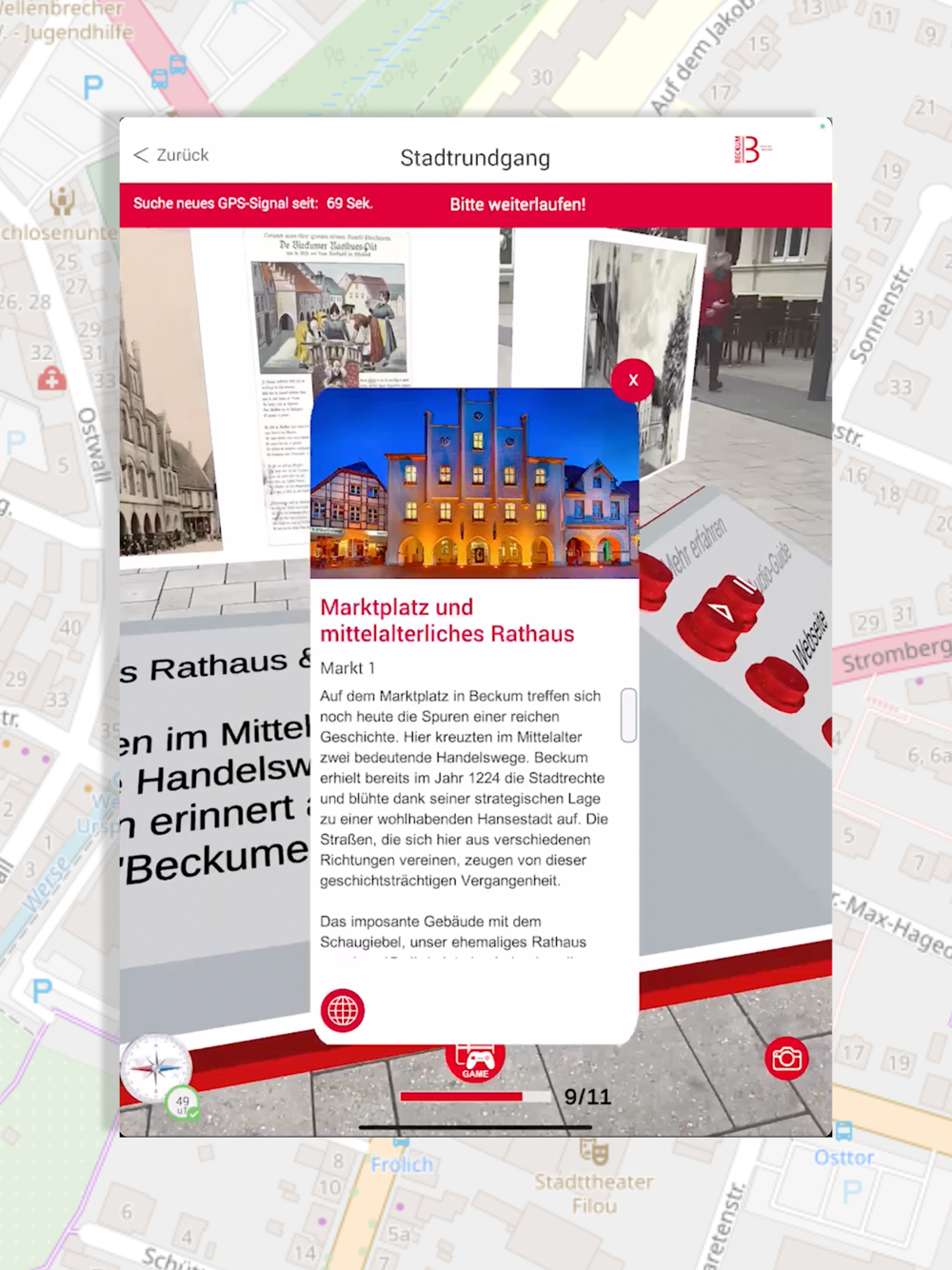 Lernen Sie interaktiv die wichtigsten Sehenswürdigkeiten des Beckumer Stadtkerns kennen. Auf dem Weg erhalten Sie immer wieder Informationen zu besonders interessanten Punkten. Weiteres Highlight: Fantastische 360°-Aufnahmen der Innenräume, Video-Geschichten, virtuelle Informationstafeln und ein Spiel.