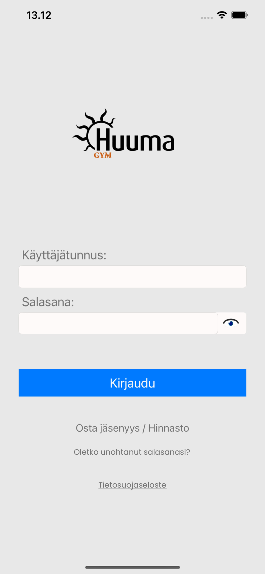 Huuma Gym applikaatio treeni tietojen katseluun ja ovien avaamiseen