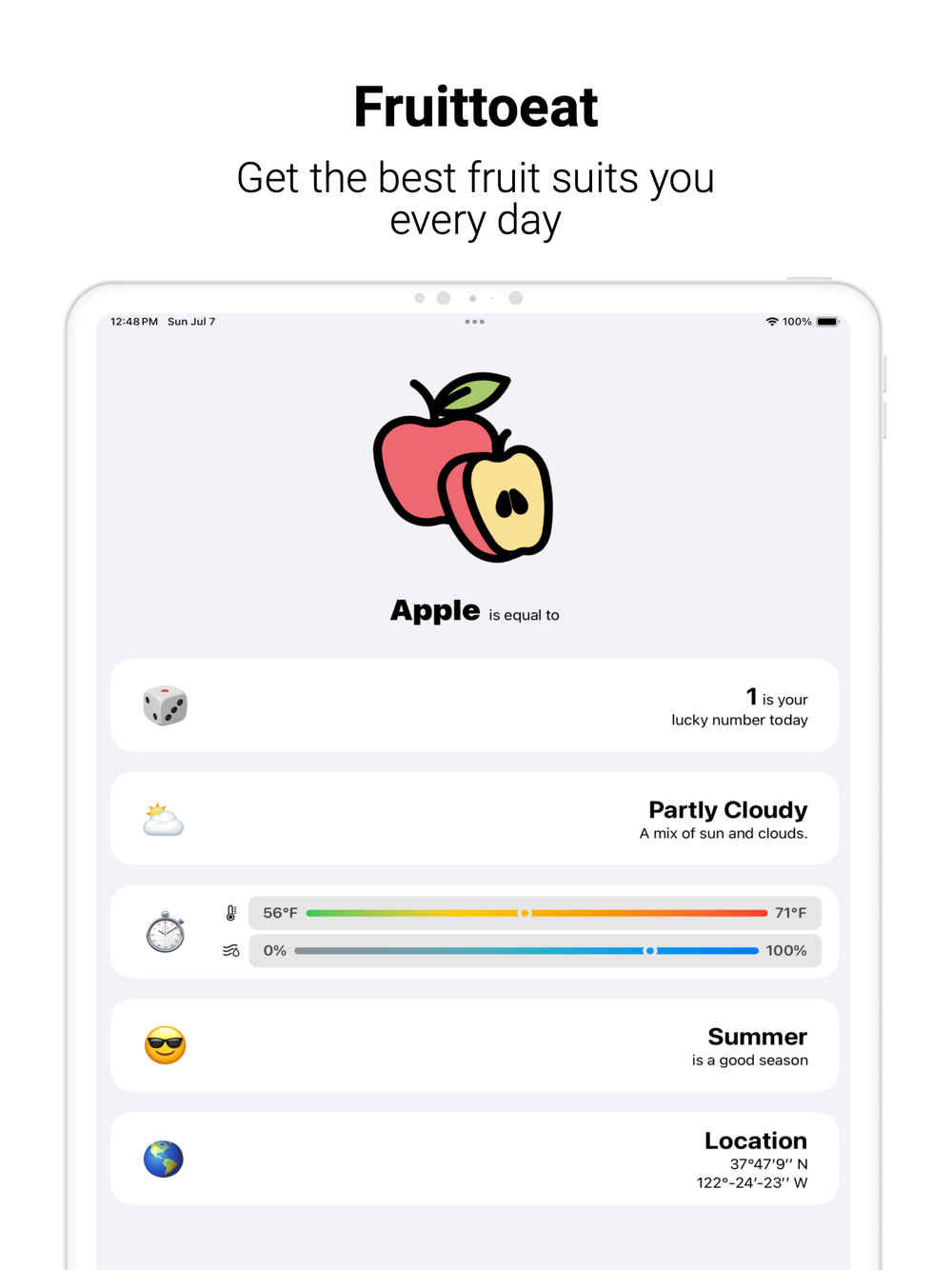 Discover the joy of healthy eating with Fruittoeat! Our app is designed to help you incorporate a delightful variety of fruits into your daily routine. With our advanced algorithm, Fruittoeat personalizes fruit suggestions based on your location, weather, nutrition, and fitness goals.