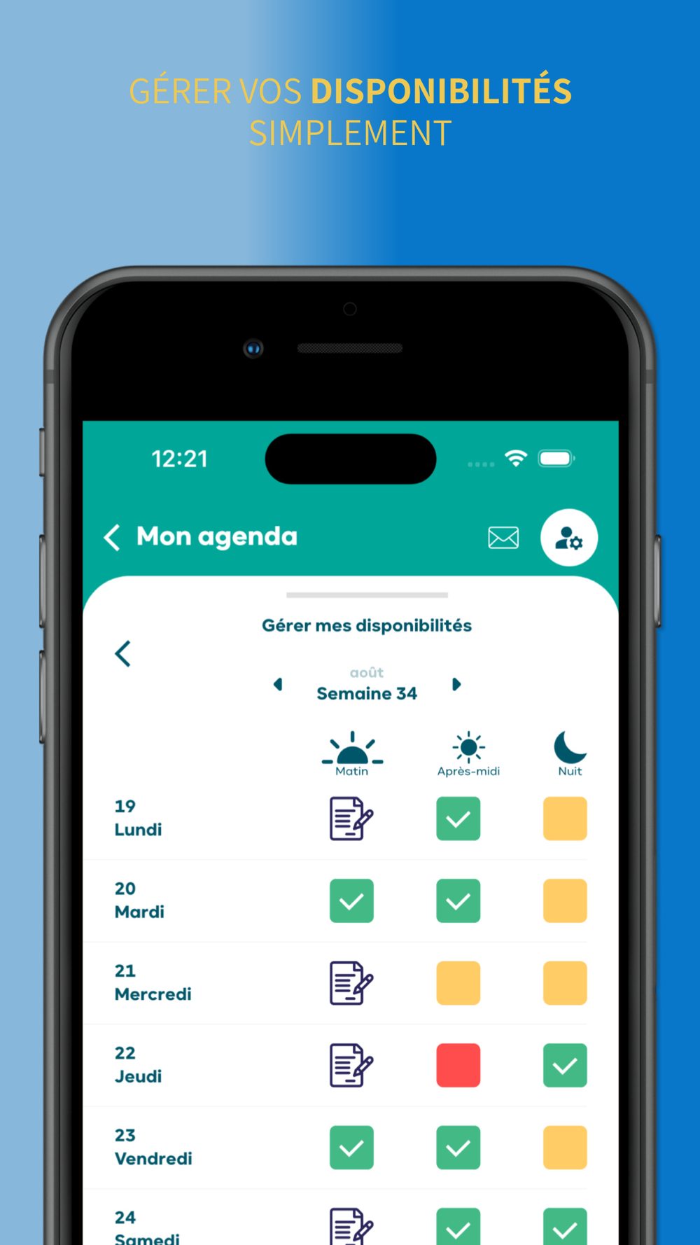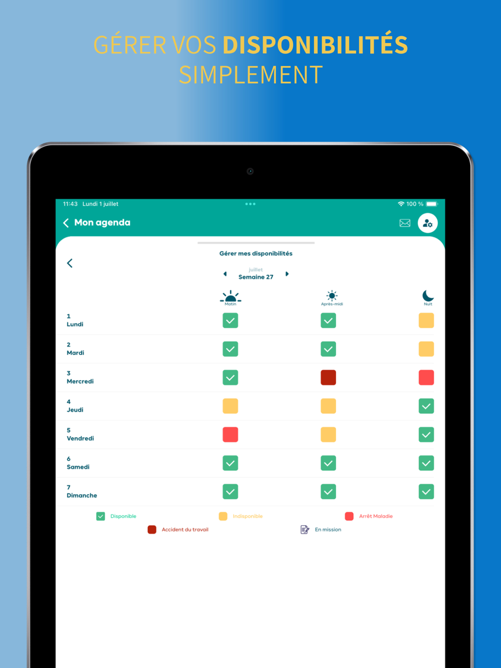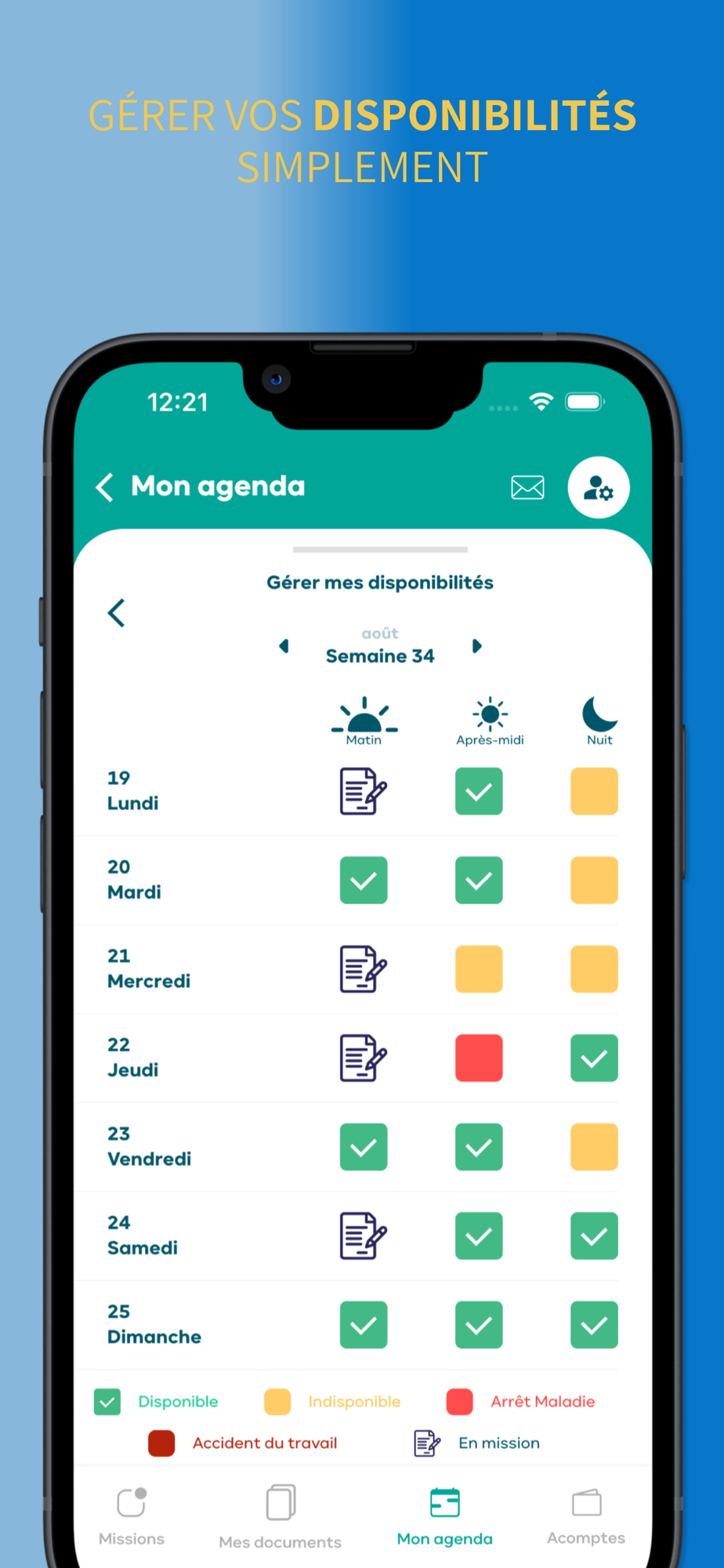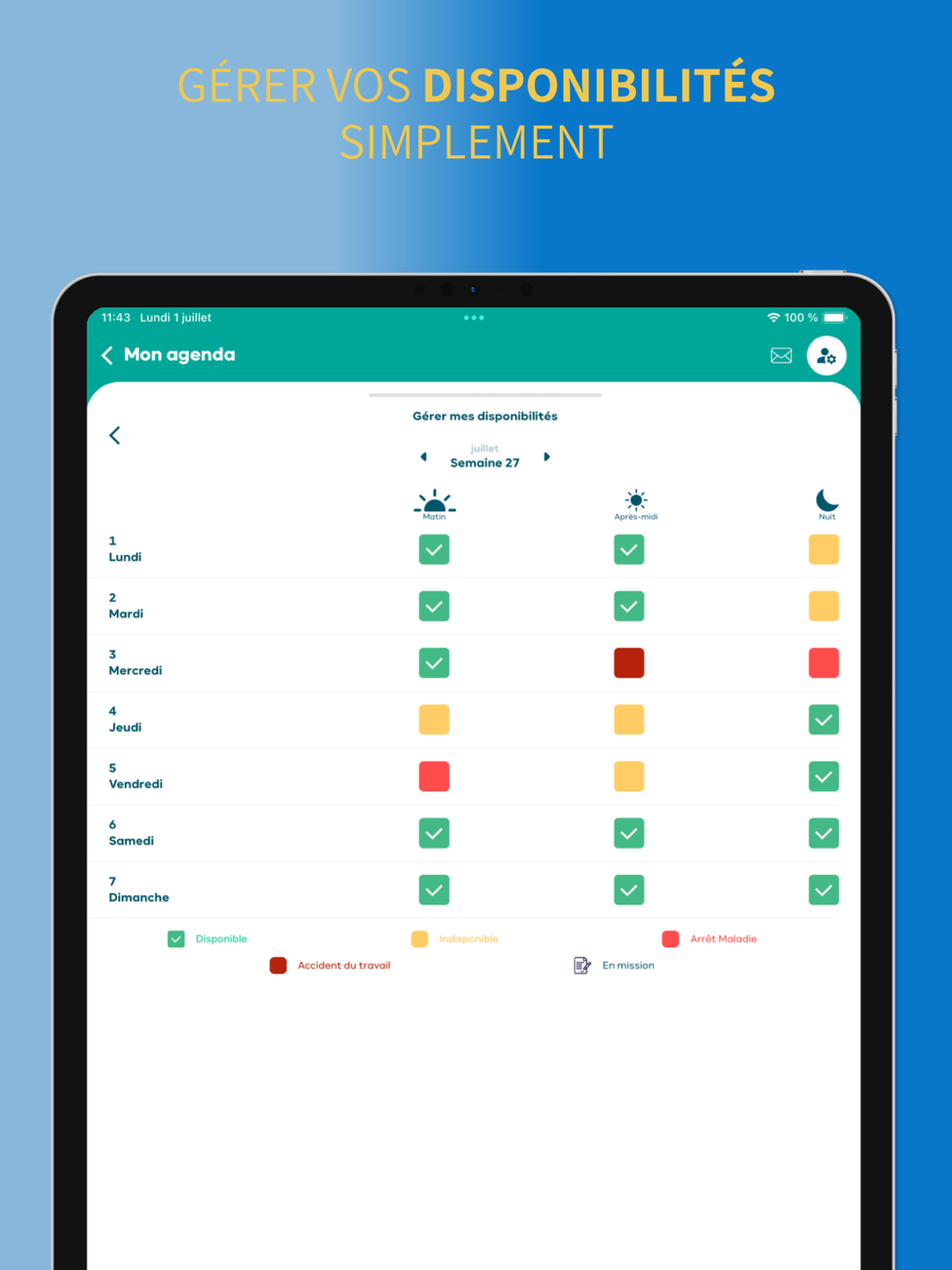 • Retrouver l'ensemble des missions qui vous sont confiées dans votre planning, indiquer vos disponibilités ou indisponibilités,