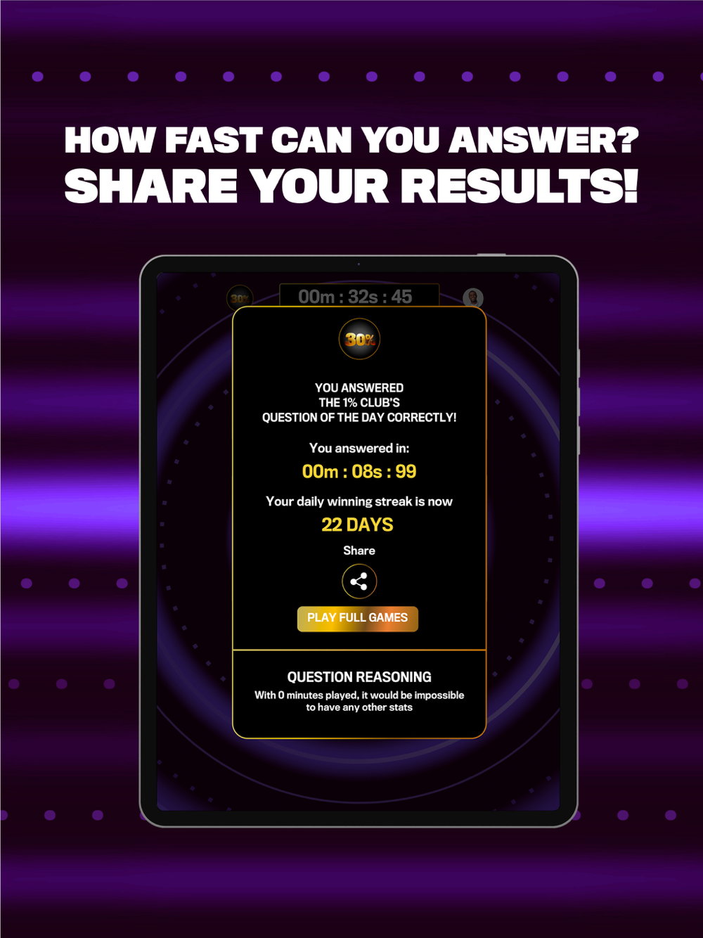 The 1% Club is unlike most quizzes! It's not about what you know, it's about how you think. Do you have what it takes to answer a question only 1% of the country would get right?
