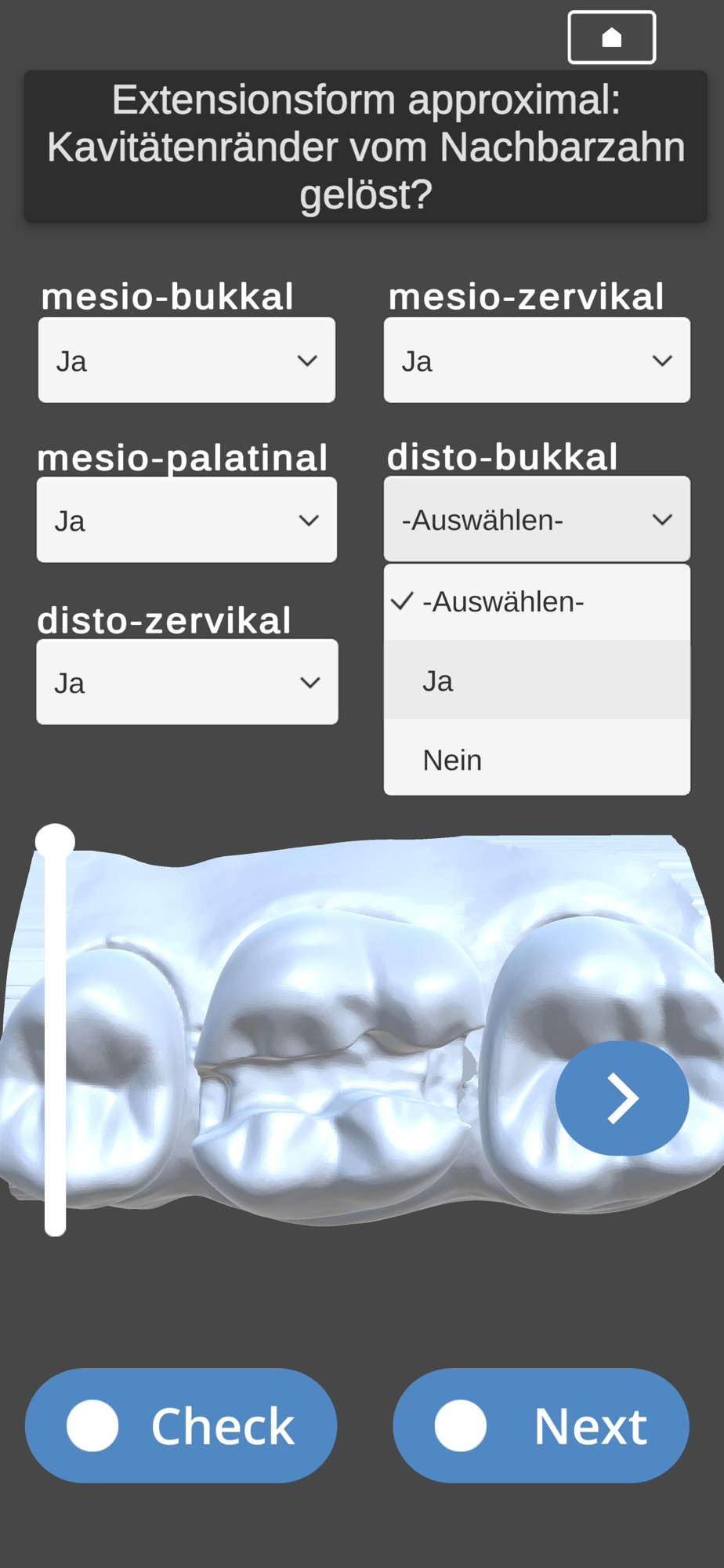 Dazu werden dreidimensionale Modelle von Kavitäten auf dem Bildschirm dargestellt, können interaktiv hin- und hergedreht und von allen Seiten werden. Nutzer*innen entscheiden dann anhand vorgegebener Kriterien, ob alle Präparationsanforderungen erfüllt sind. Nach jedem Kriterium überprüfen die Nutzer*innen, ob sie alle Fehler gefunden haben.