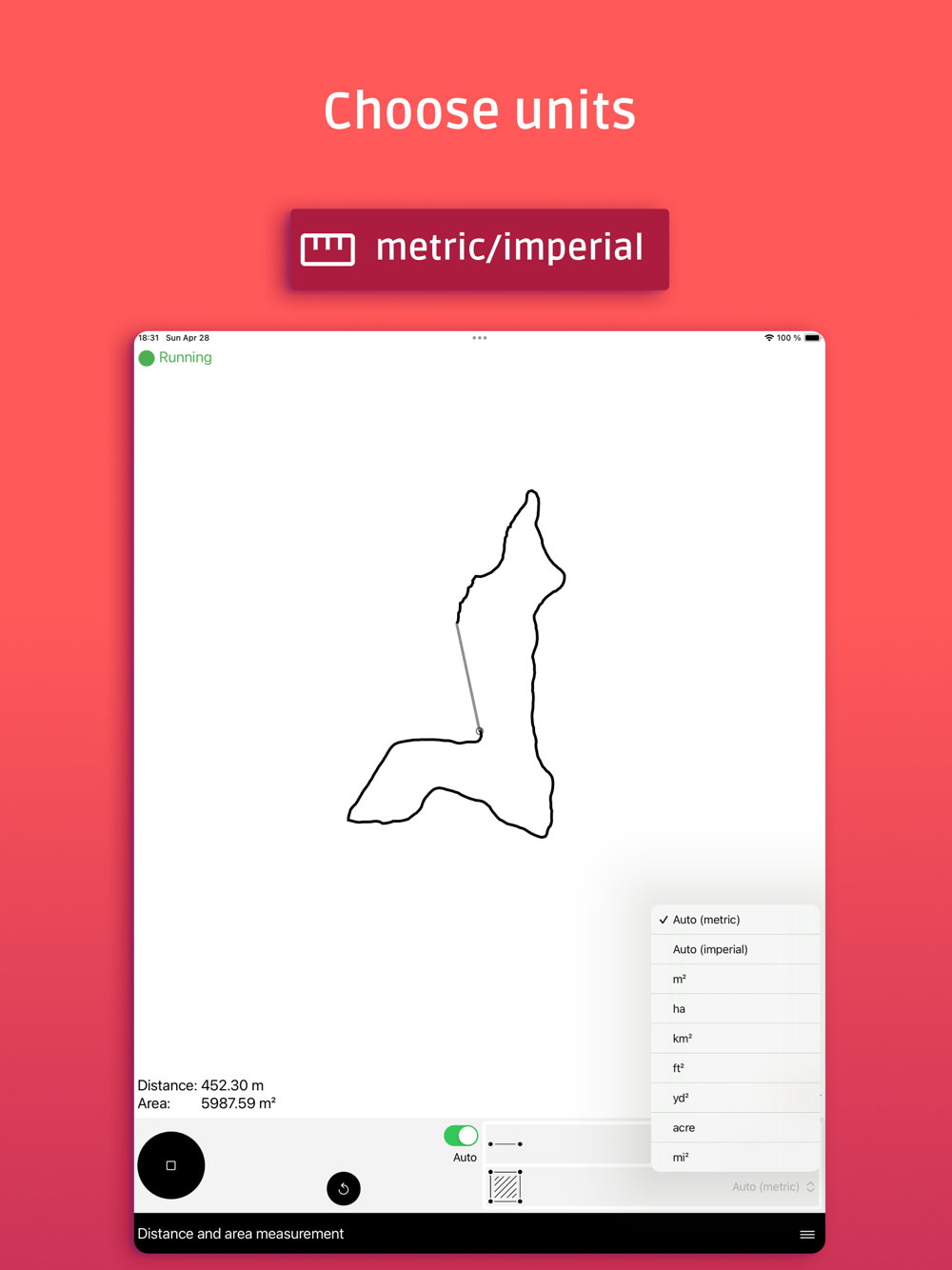 Turn this application on and walk or drive around a region to measure its area. The path's length is measured as well.