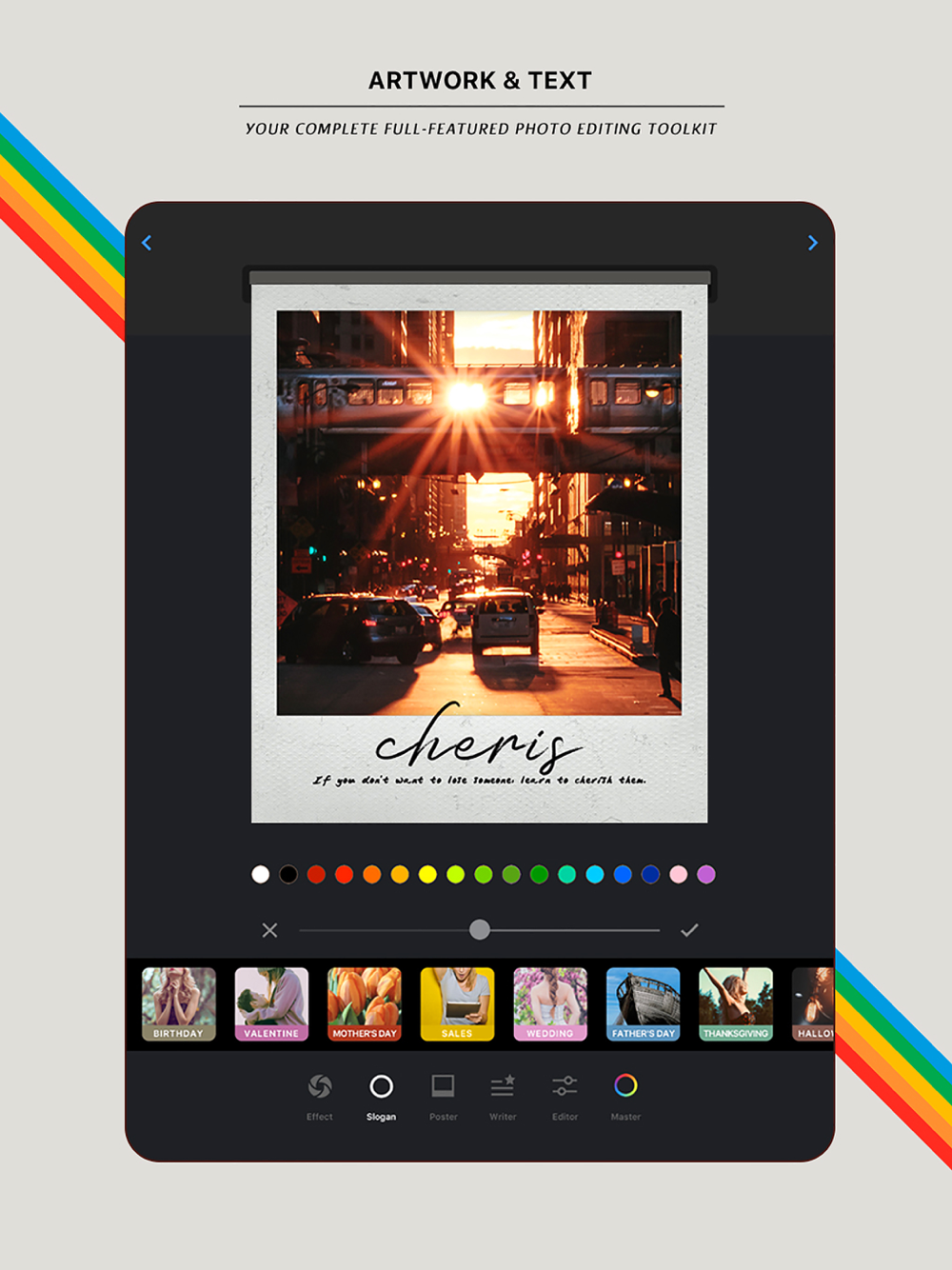 Photo Edítor for quick and straight forward editing, a unique way to add artwork, beautiful message, photos of your daily life and traveling can be depicted as the most memorable moment, Be a part of this awesome design expression through photography, Photo Edítor lets you express even the most subtle mood on your photos.