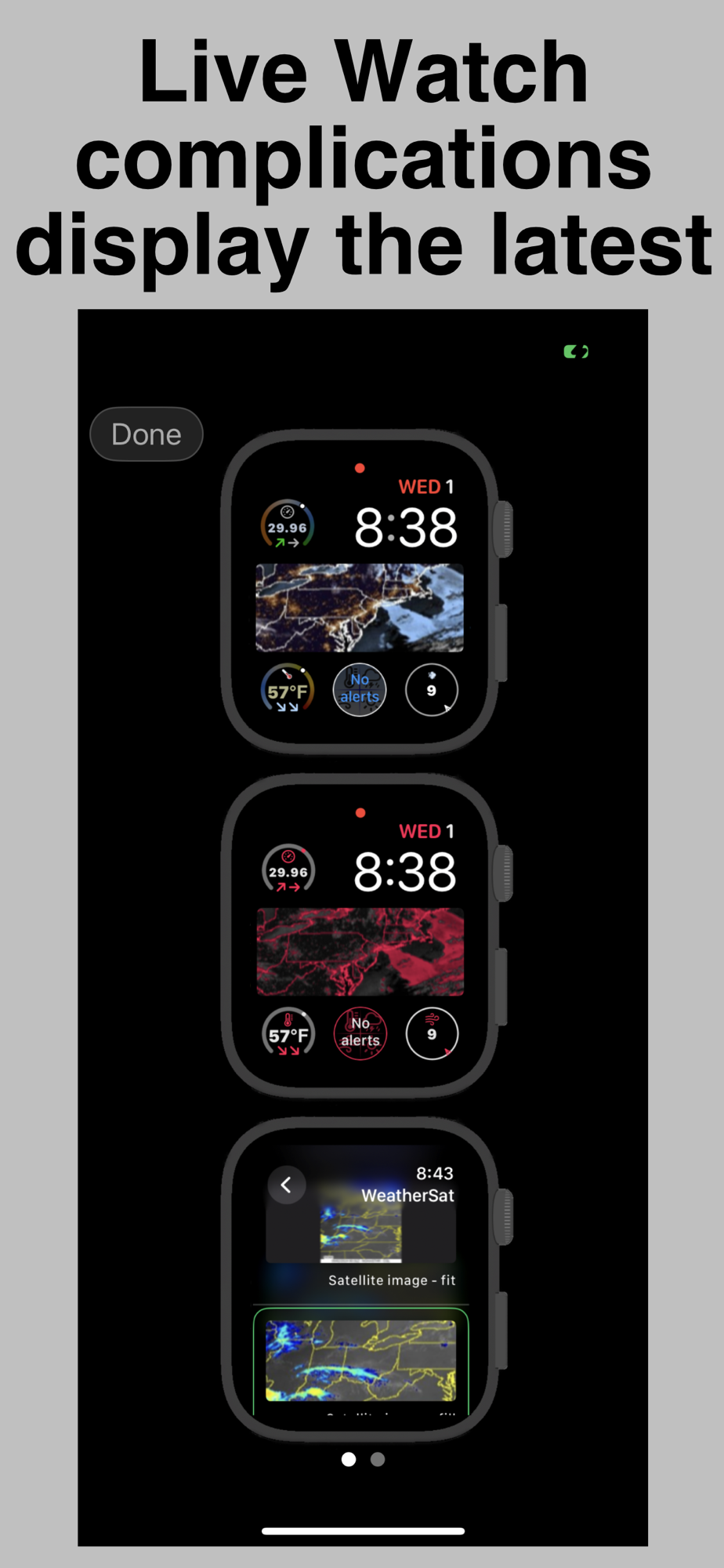 WeatherSat lets you easily view NOAA's weather satellite imagery covering half the globe. Make the weather come alive using the app's animation feature that shows weather changes over the course of a day. Explore different visualizations such as lightening and wind, and enjoy watching the ever-changing flow of weather systems. WeatherSat can run completely standalone on your Watch, and supports iPhone widgets, lock screen widgets, and Watch complications. If you're interested in weather, WeatherSat will let you see it unfold in a whole new way.
