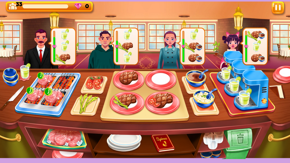 In each restaurant, the goal is to serve different customers before the timer runs out and before your lifeline depletes. You must satisfy the customers so they leave with happy faces, not dissatisfied. You don't want to waste food or burn it!