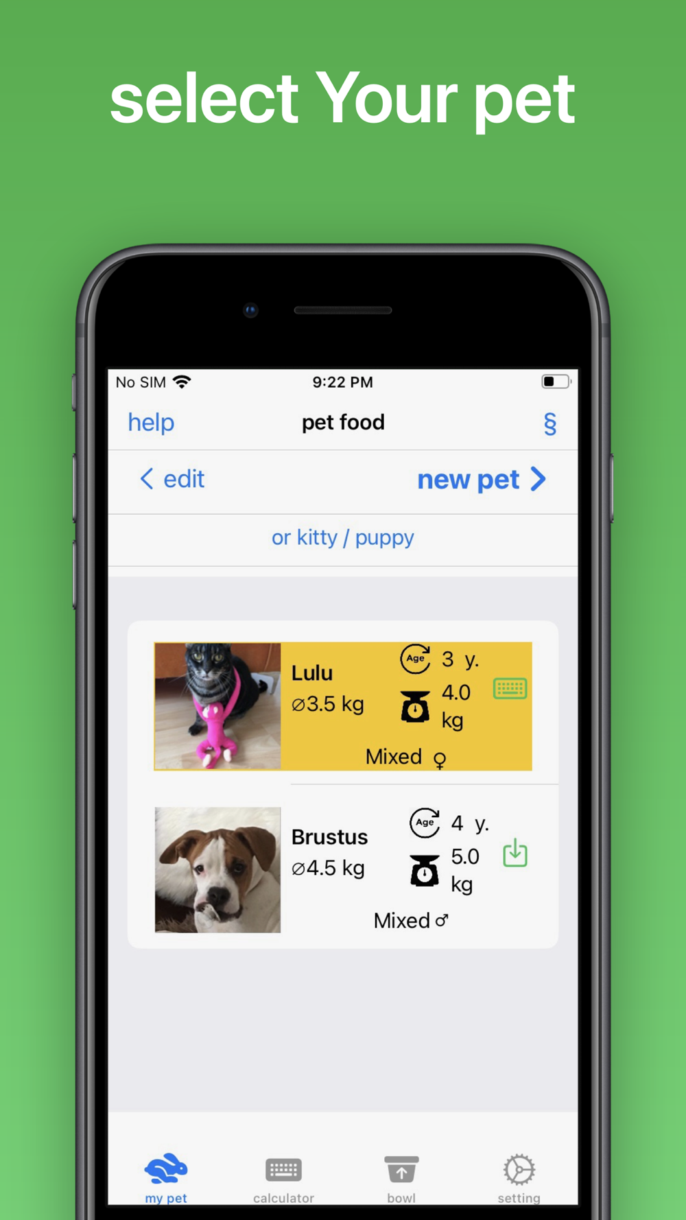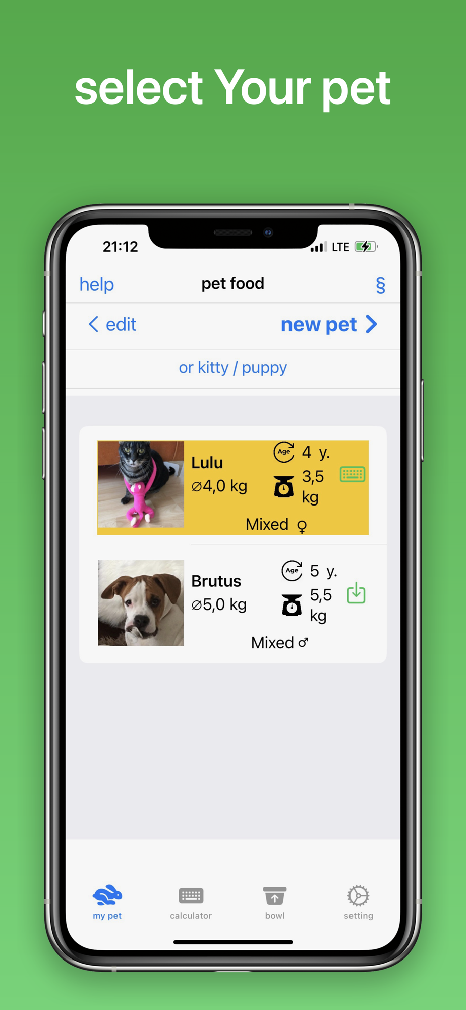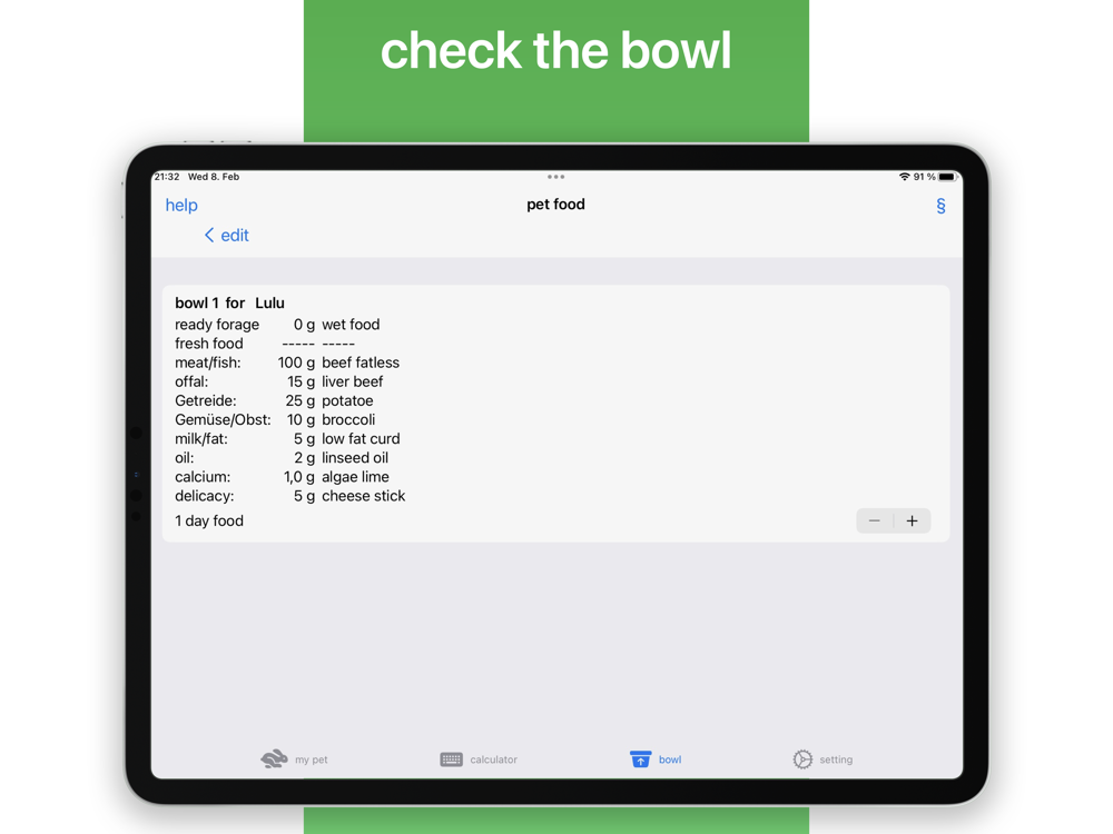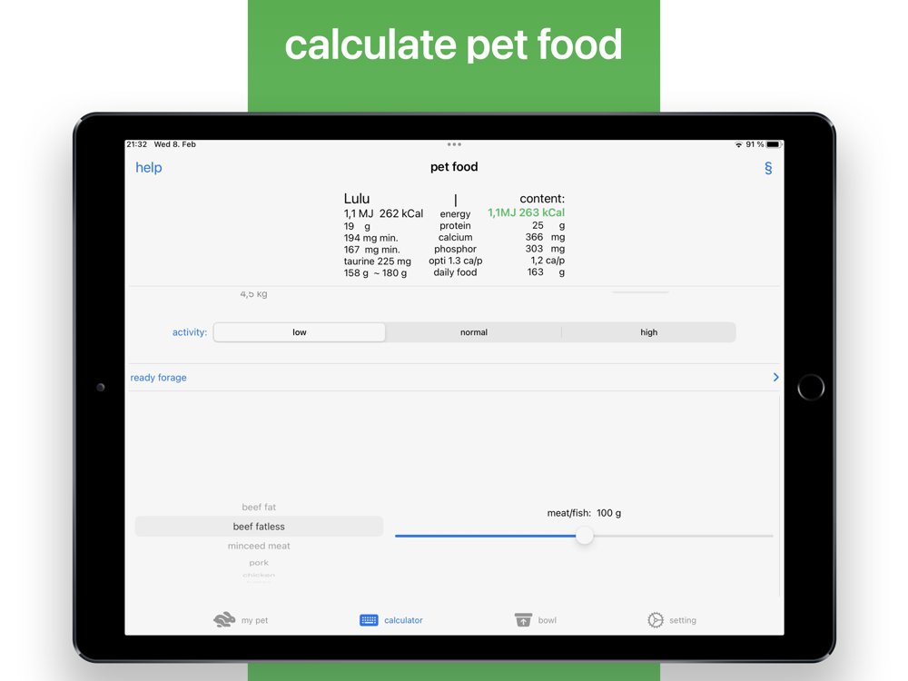 Your dog or cat needs different nutrients and minarals depending on their age and weight. The app pet food fresh helps You choosing age and weight, to compile individual the best balanced nutrition. Pet food fresh accompanies You through the entire life of your pet, from puppies to any age, when your pet needs completely different food.