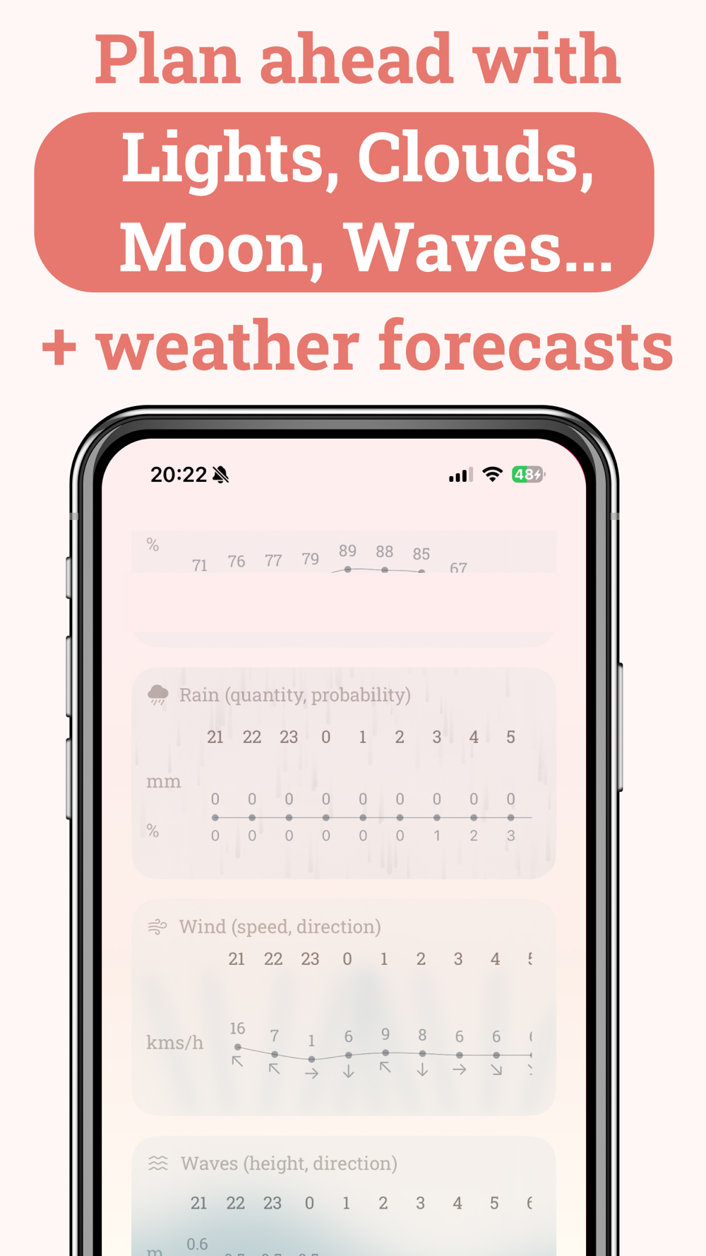 Access cloud coverage, temperature, humidity, wind speed, wave conditions, and visibility. Solora also includes moonrise and moonset times, moon phases, and night sky clarity.