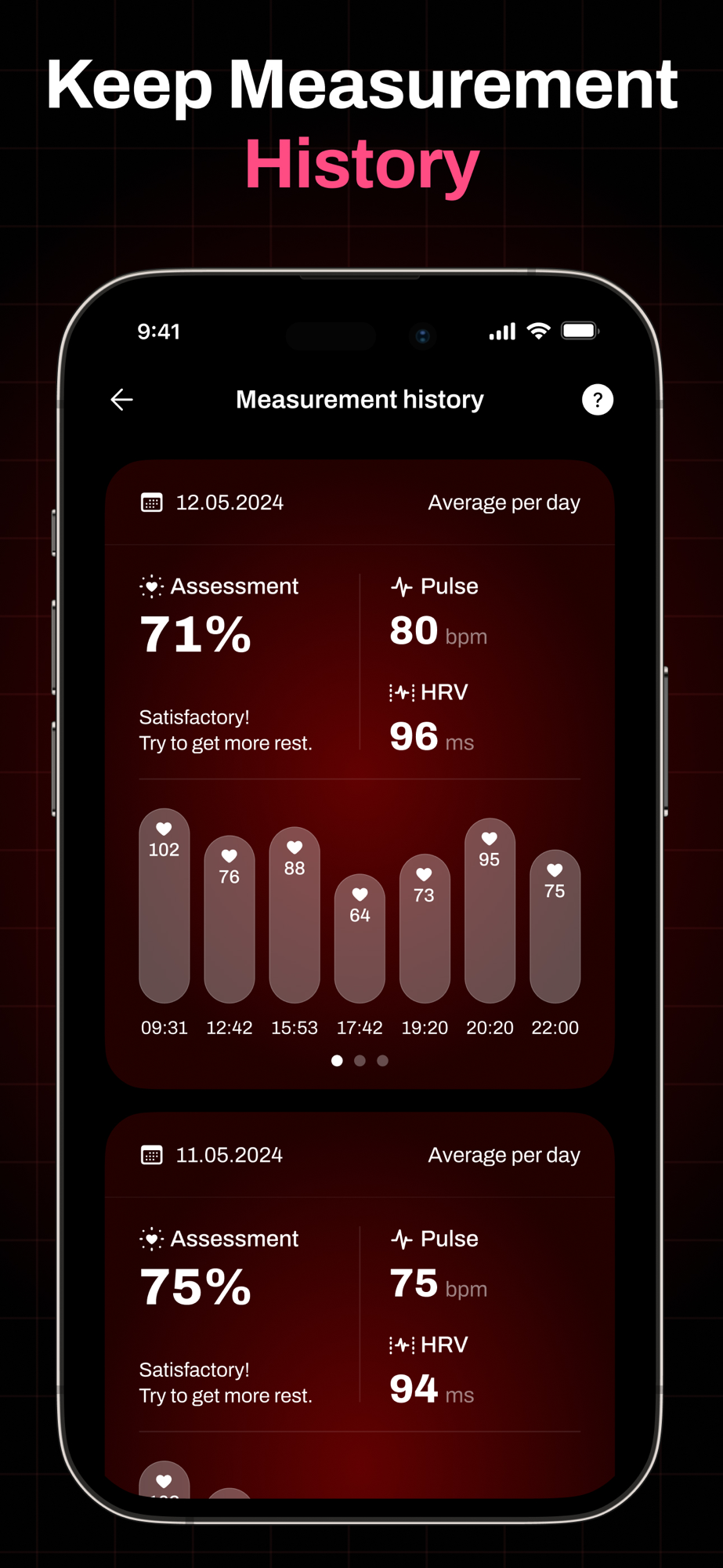 Utilizing just your smartphone's camera, app accurately measures your pulse and HRV, furnishing valuable data on your body's responses to stressors, physical activities, and more. It delivers personalized recommendations based on your heart rate and HRV readings, enabling informed decision-making about your well-being.