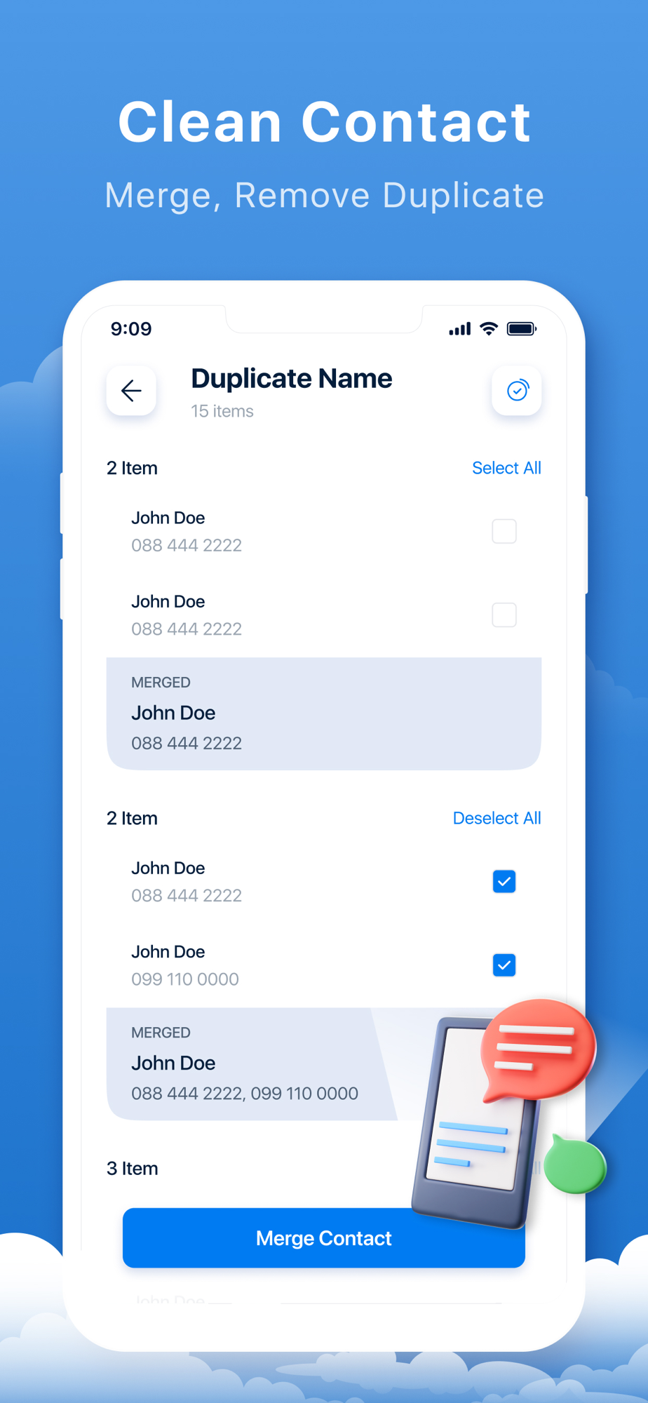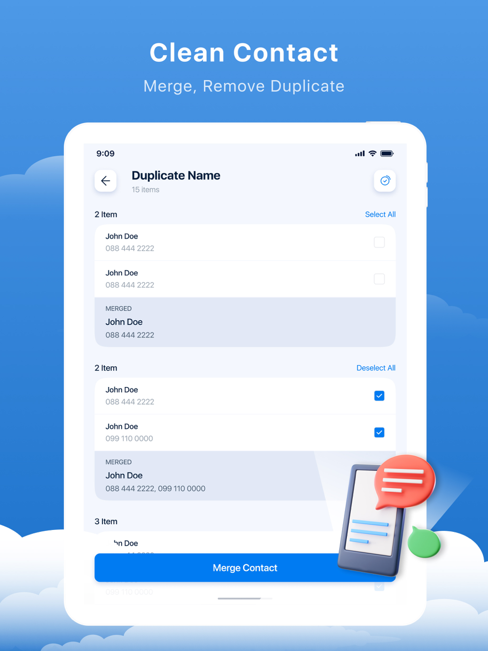 - Contacts Cleanup: Quickly find and merge duplicate or incomplete contacts with one easy tap.